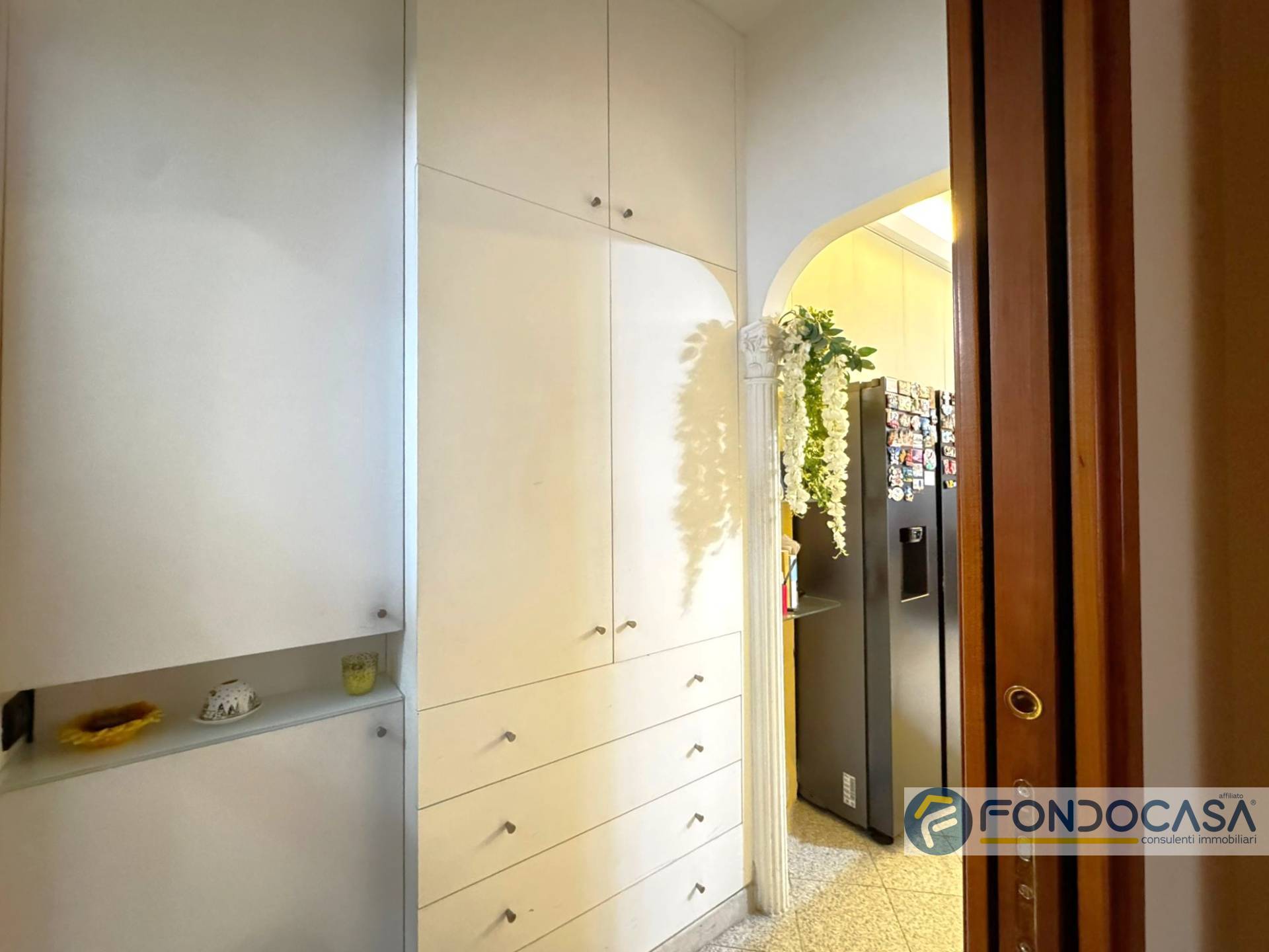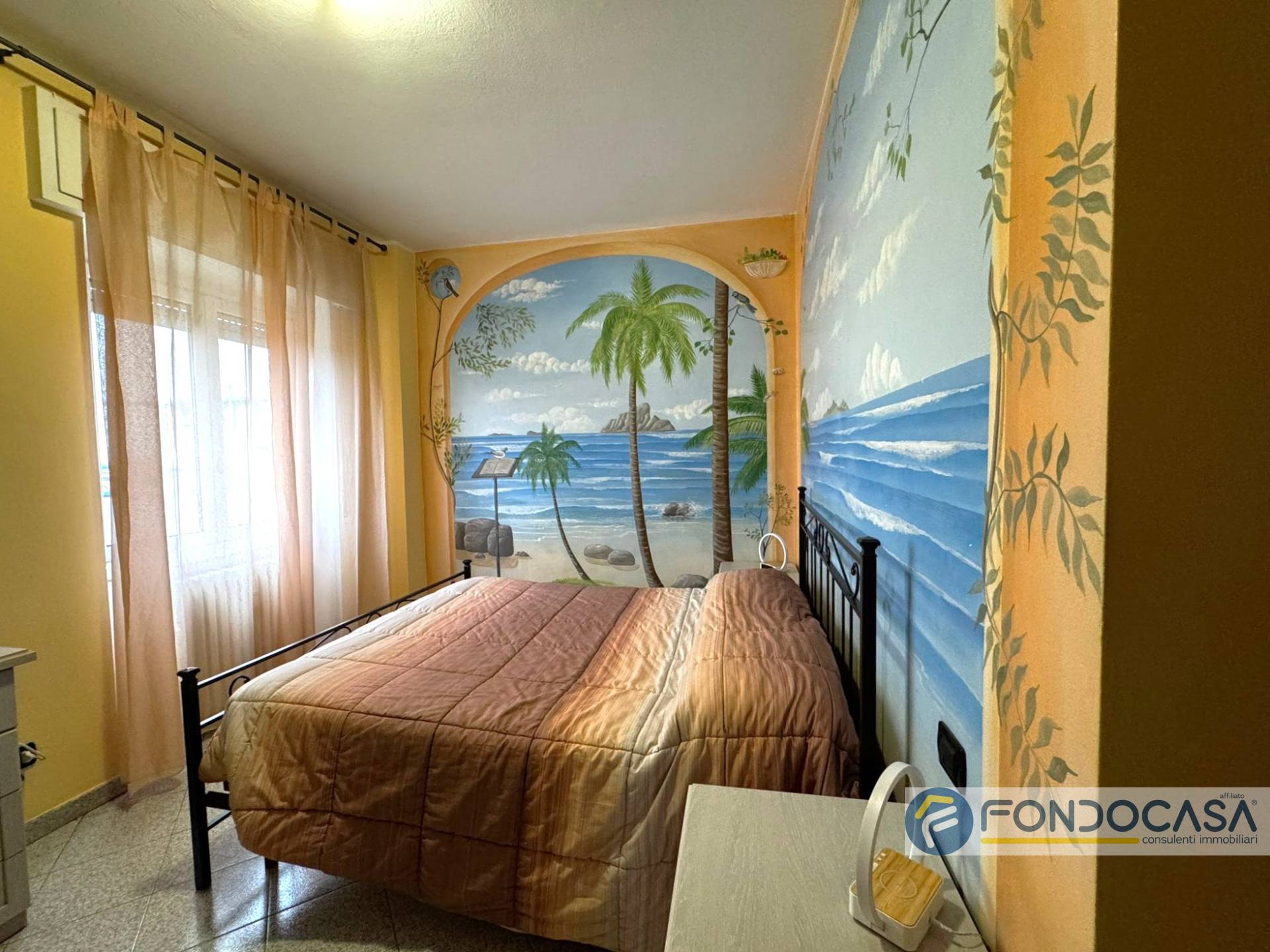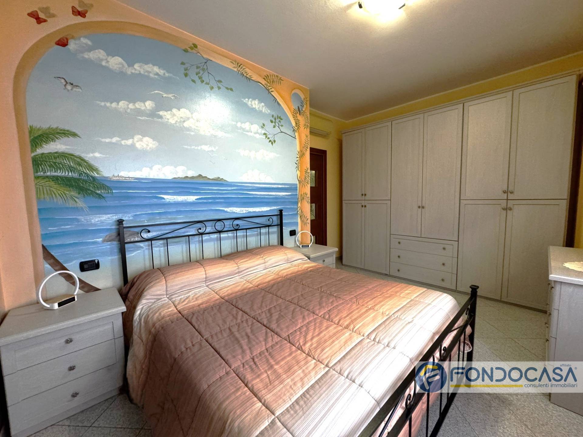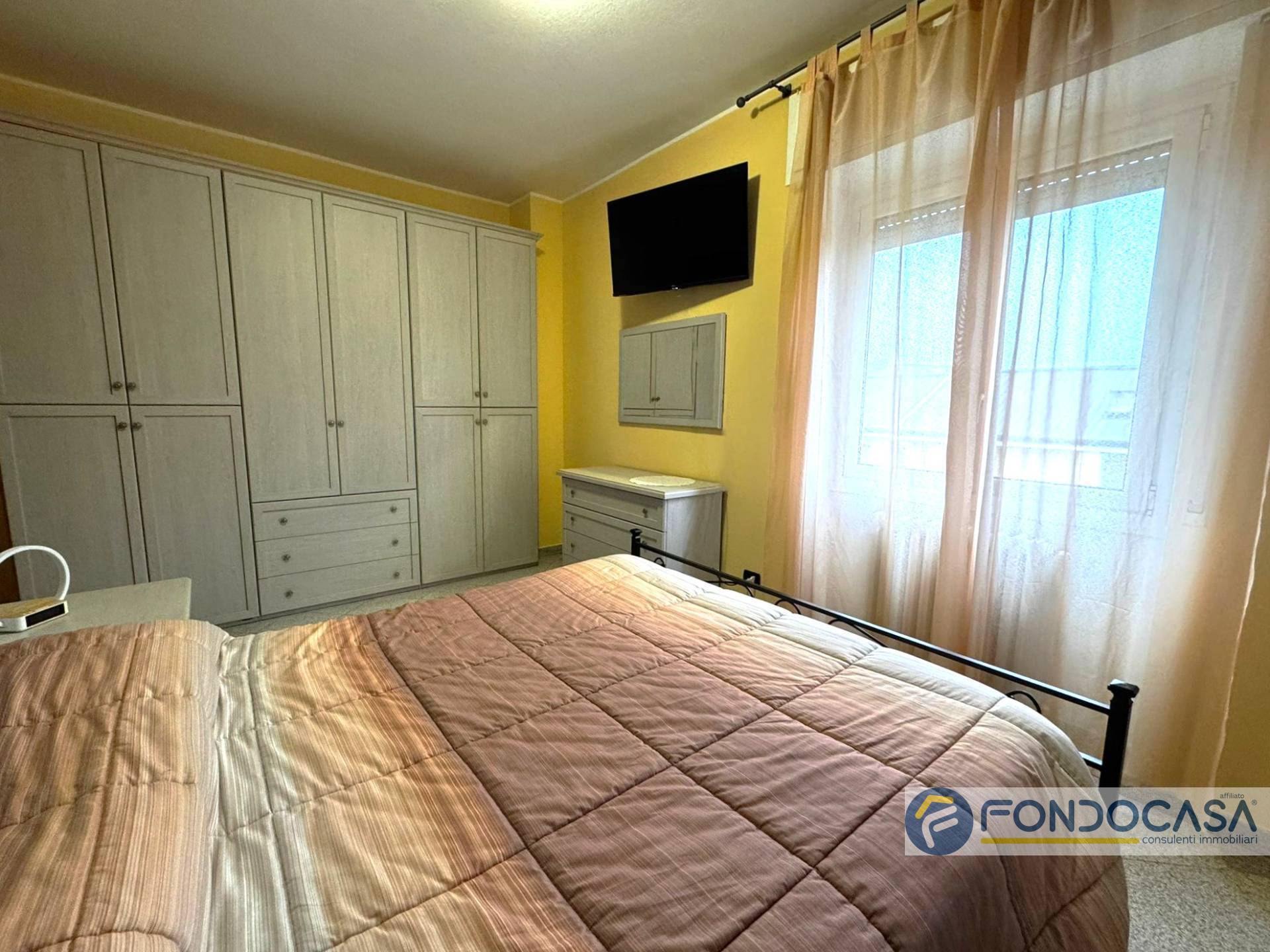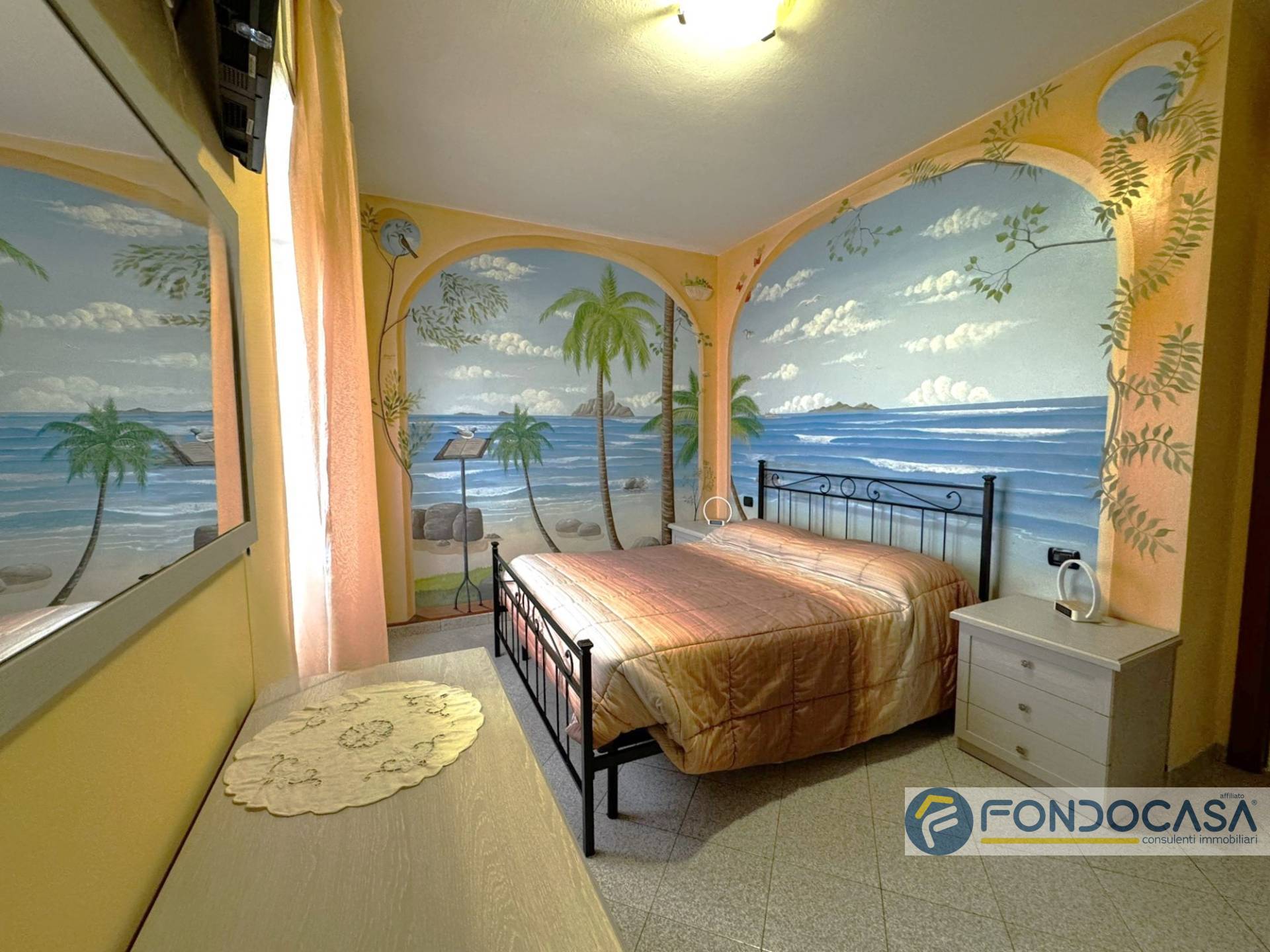 L'appartamento si apre sulla zona giorno con cucina a vista realizzata in muratura e uscita su balcone, disimpegno, ampia camera matrimoniale, bagno con vasca e cameretta/studio.