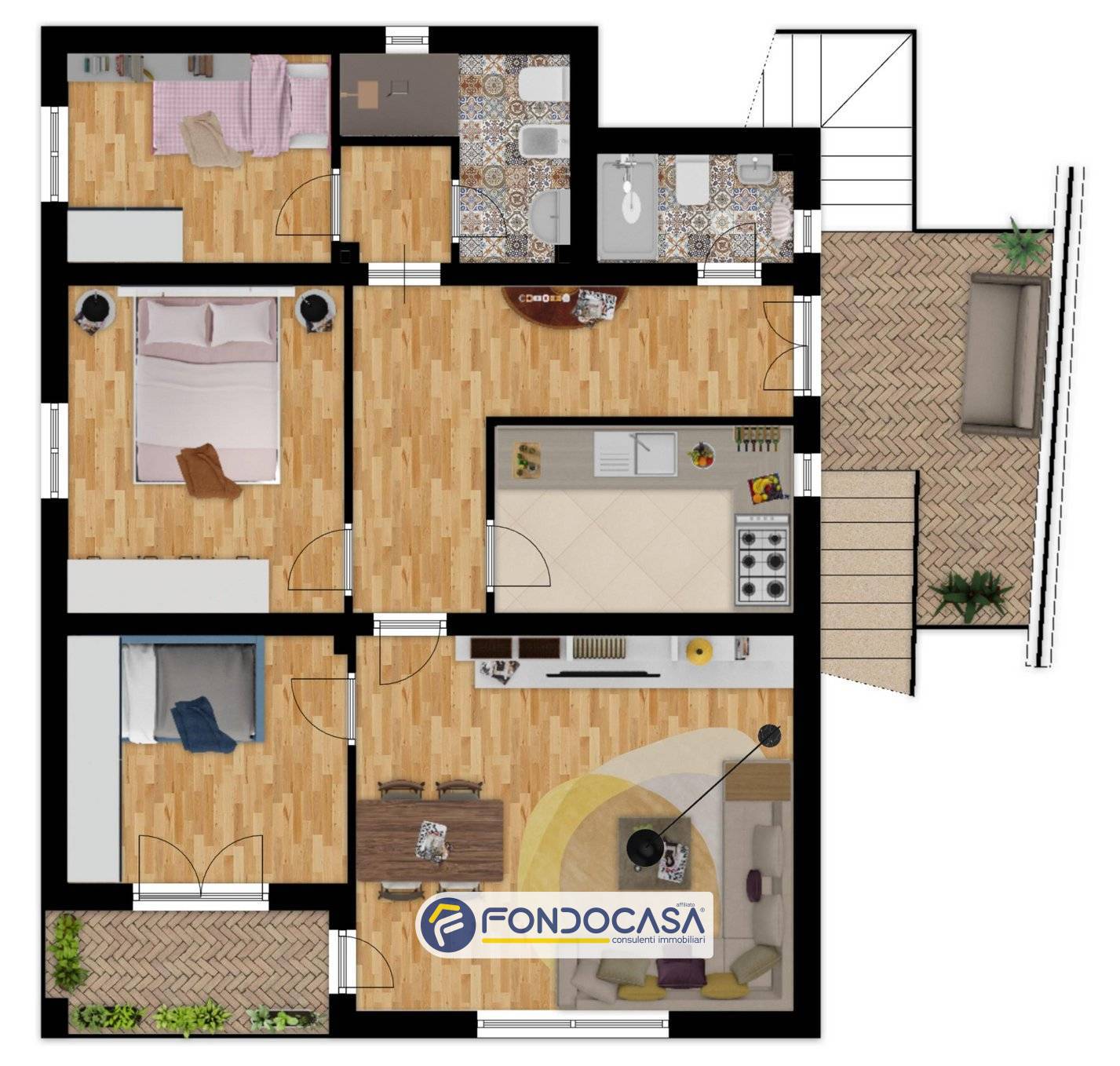 Al piano superiore si sviluppa un pentalocale con ingresso su corridoio, due bagni e tre camere, oltre a cucina e soggiorno. Il piano è valorizzato da un balcone, accessibile sia dal soggiorno che da una delle camere, che dona maggiore ariosità e luminosità agli spazi interni.