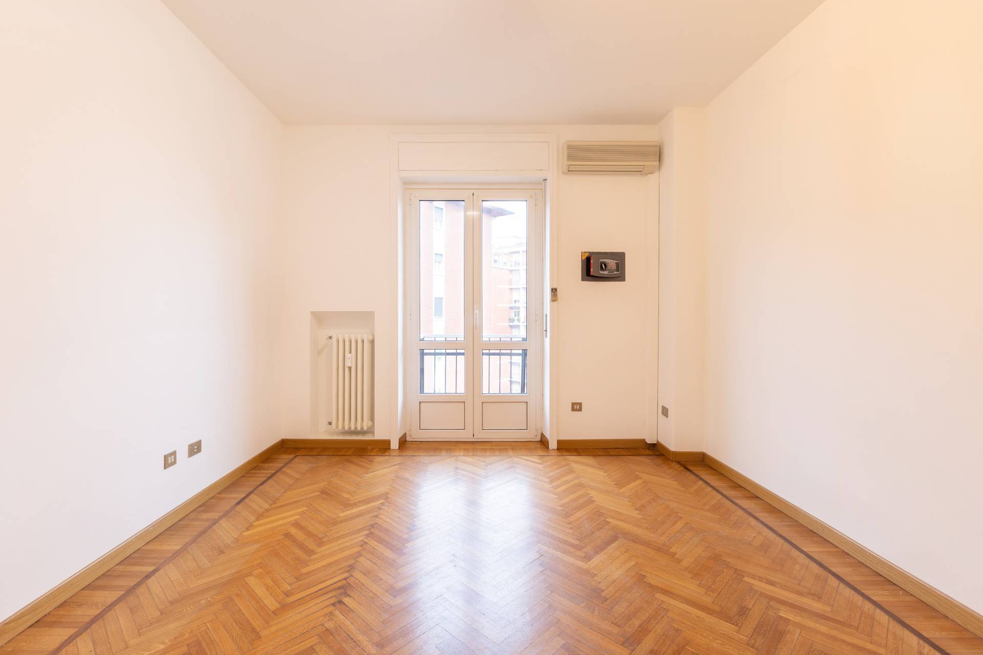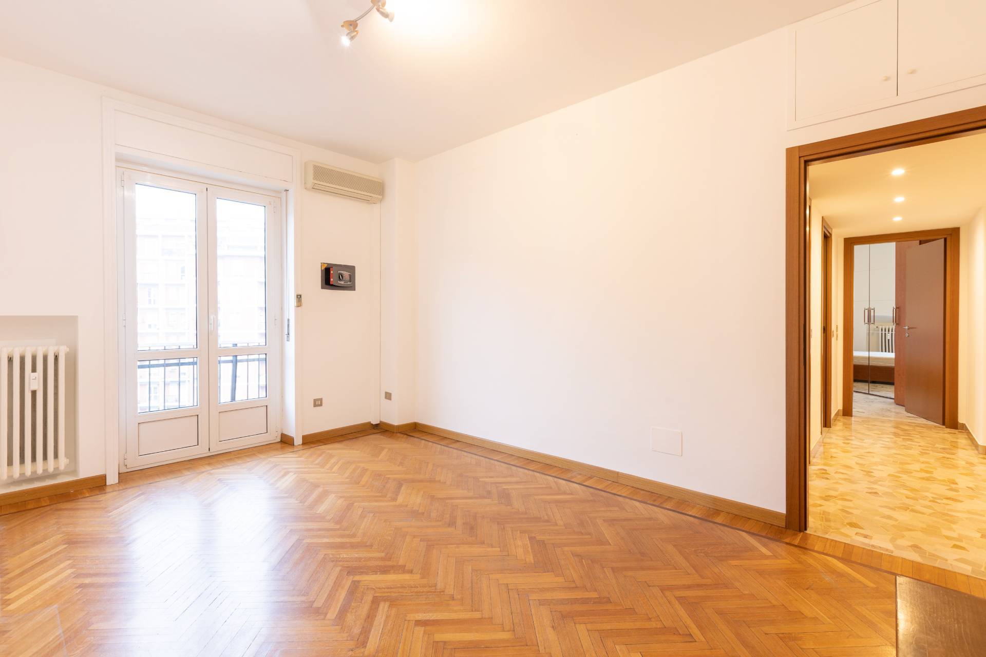 - ampio soggiorno con parquet, split aria condizionata e accesso al balcone che percorre l´intero appartamento