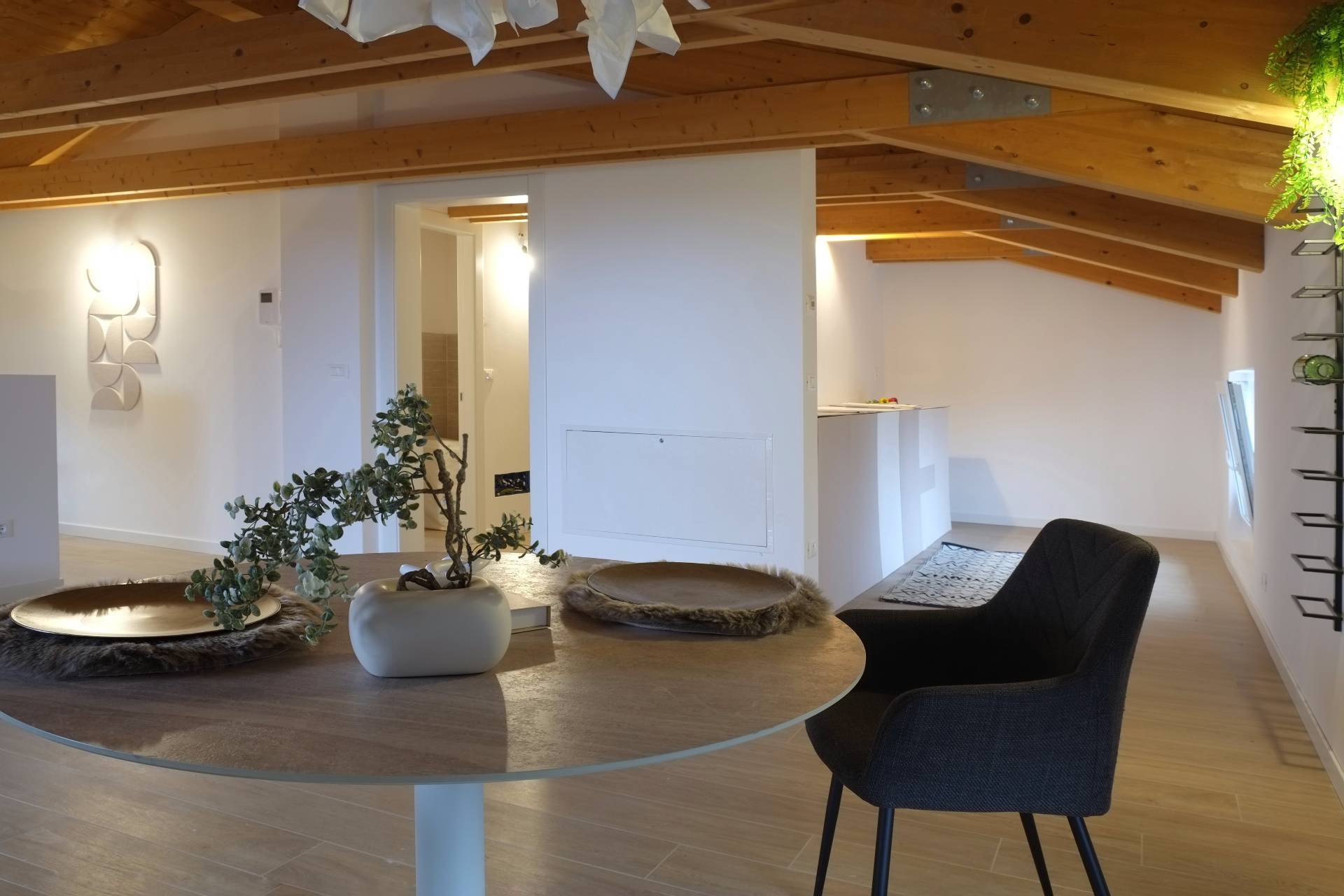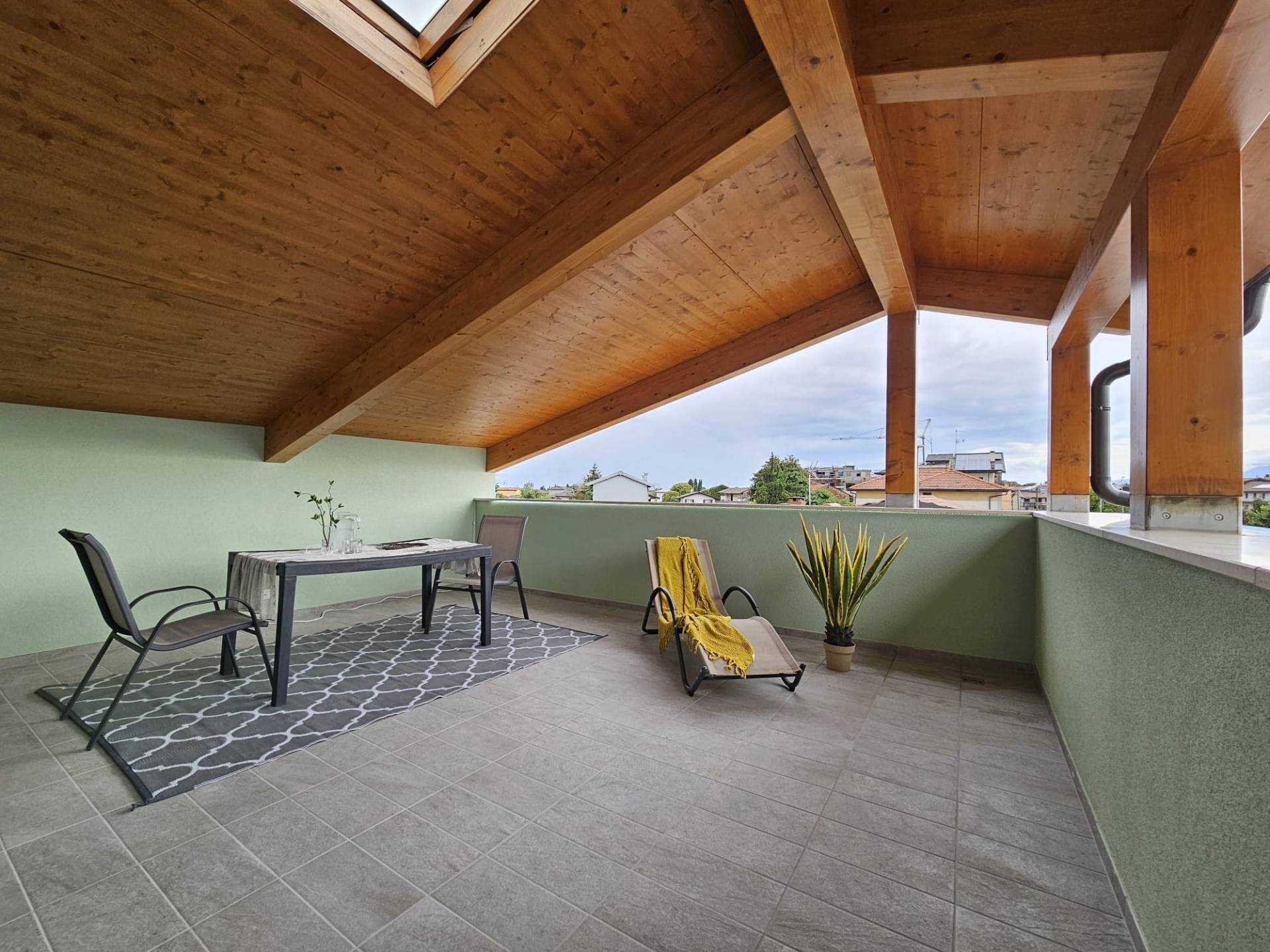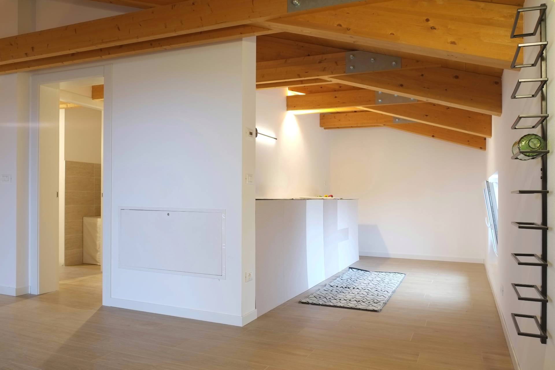 Cordenons in zona poco distante dal centro, attico in piccola palazzina di recente ultimazione, al secondo piano tutto travi a vista e con grande terrazzo abitabile riscaldato e bellissima vista. Composto da ingresso su ampia zona giorno con cucina separata, disimpegno attrezzabile, due camere matrimoniali e due bagni. Completo di due posti auto scoperti nella corte condominiale. Ottime finiture, dispone di impianto fotovoltaico autonomo, riscaldamento a pavimento, aria condizionata. Perfetto da subito!