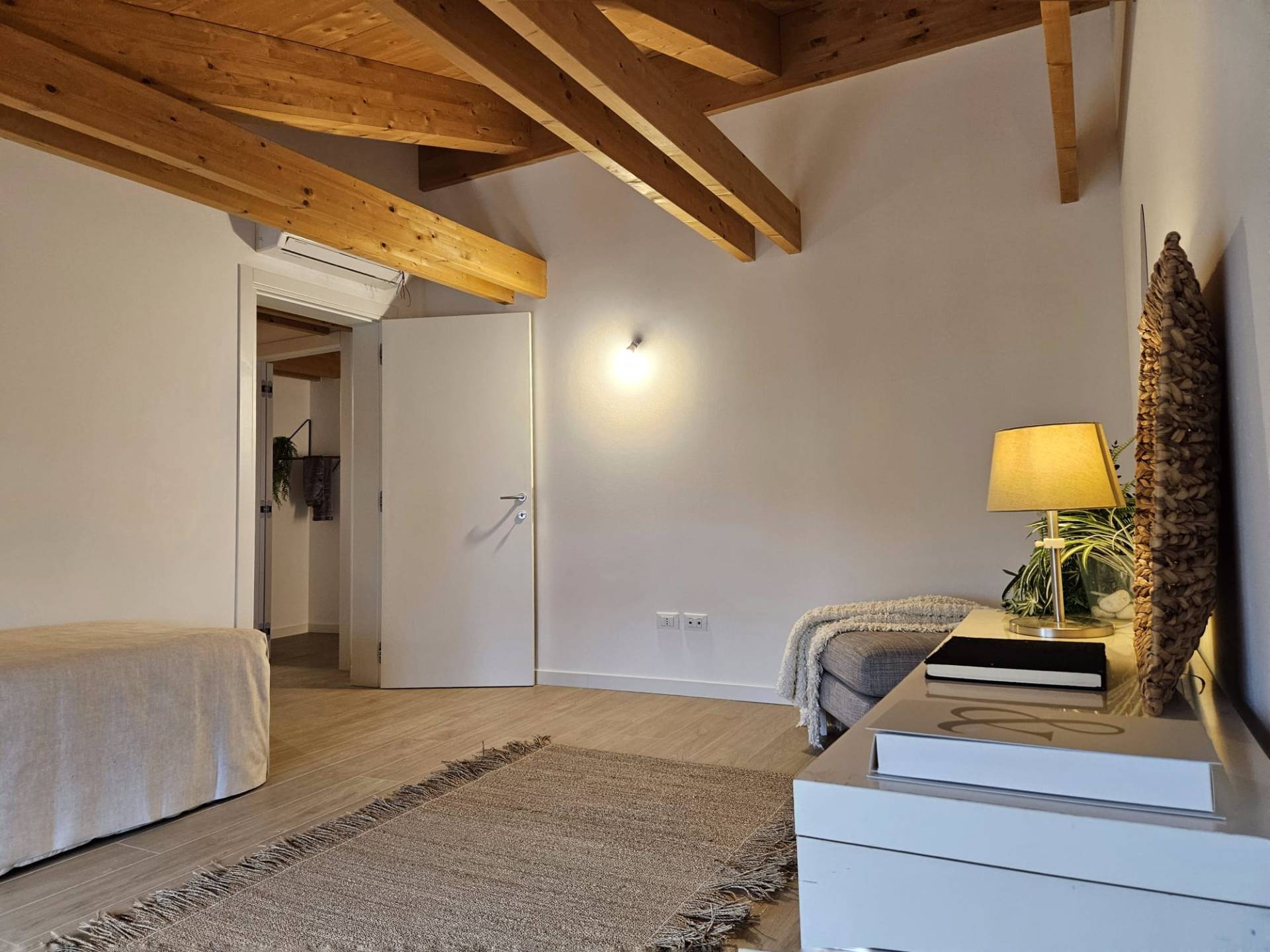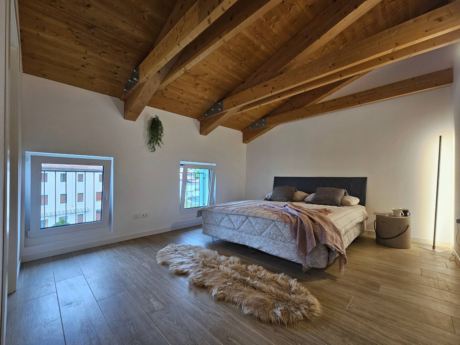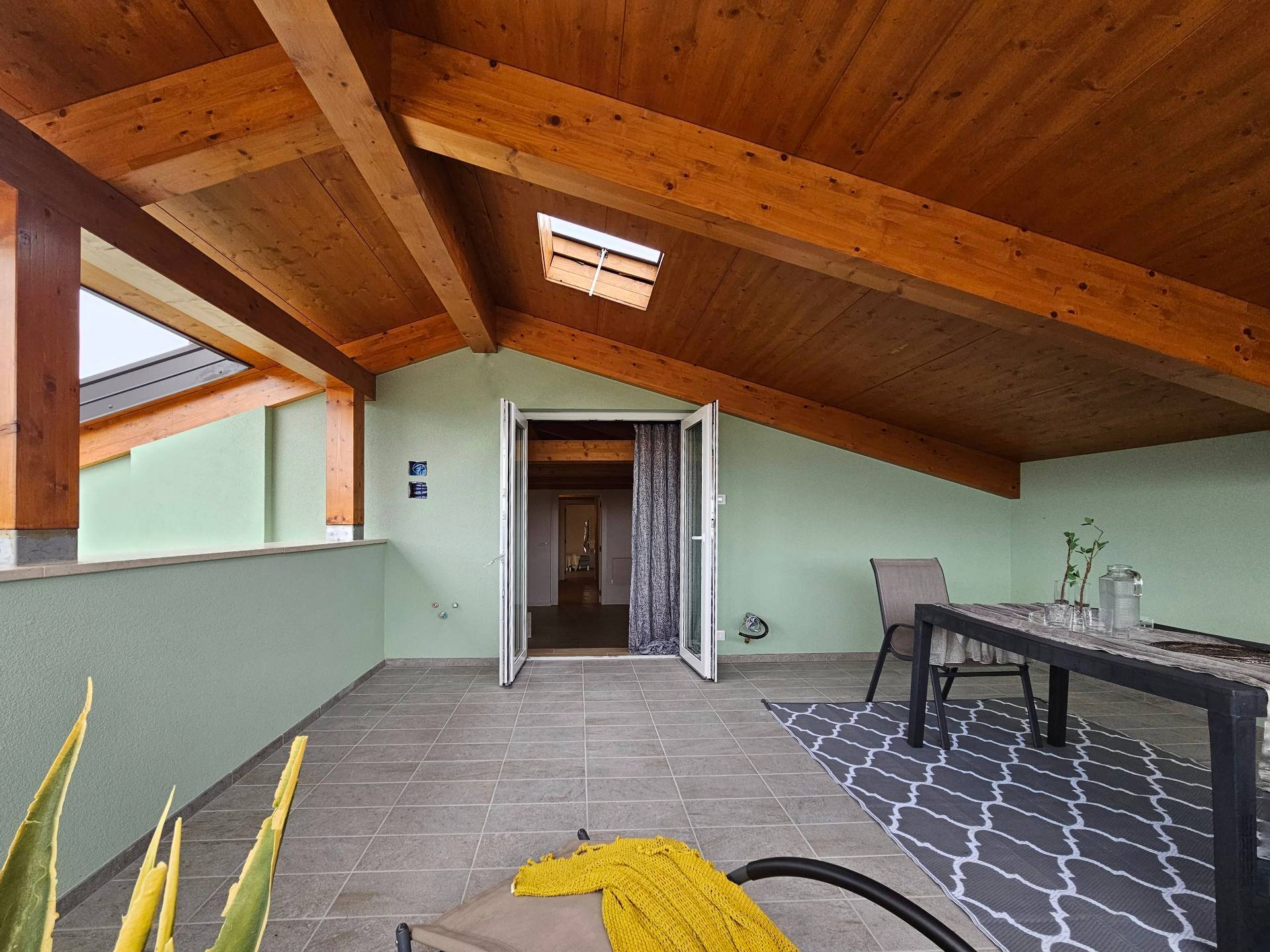 Cordenons in zona poco distante dal centro, attico in piccola palazzina di recente ultimazione, al secondo piano tutto travi a vista e con grande terrazzo abitabile riscaldato e bellissima vista. Composto da ingresso su ampia zona giorno con cucina separata, disimpegno attrezzabile, due camere matrimoniali e due bagni. Completo di due posti auto scoperti nella corte condominiale. Ottime finiture, dispone di impianto fotovoltaico autonomo, riscaldamento a pavimento, aria condizionata. Perfetto da subito!