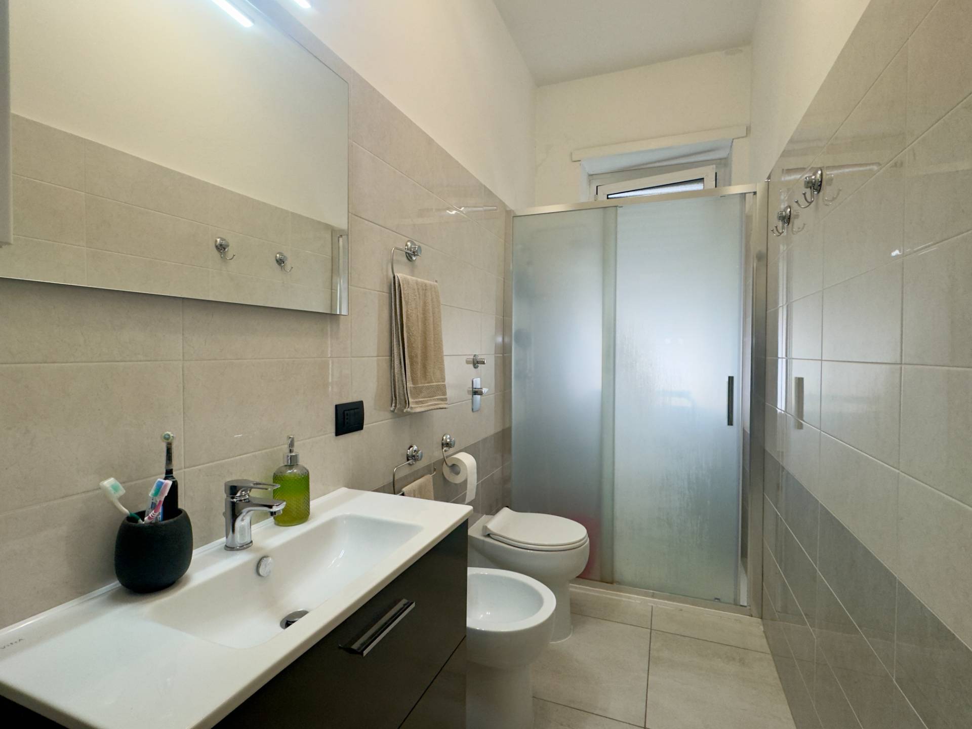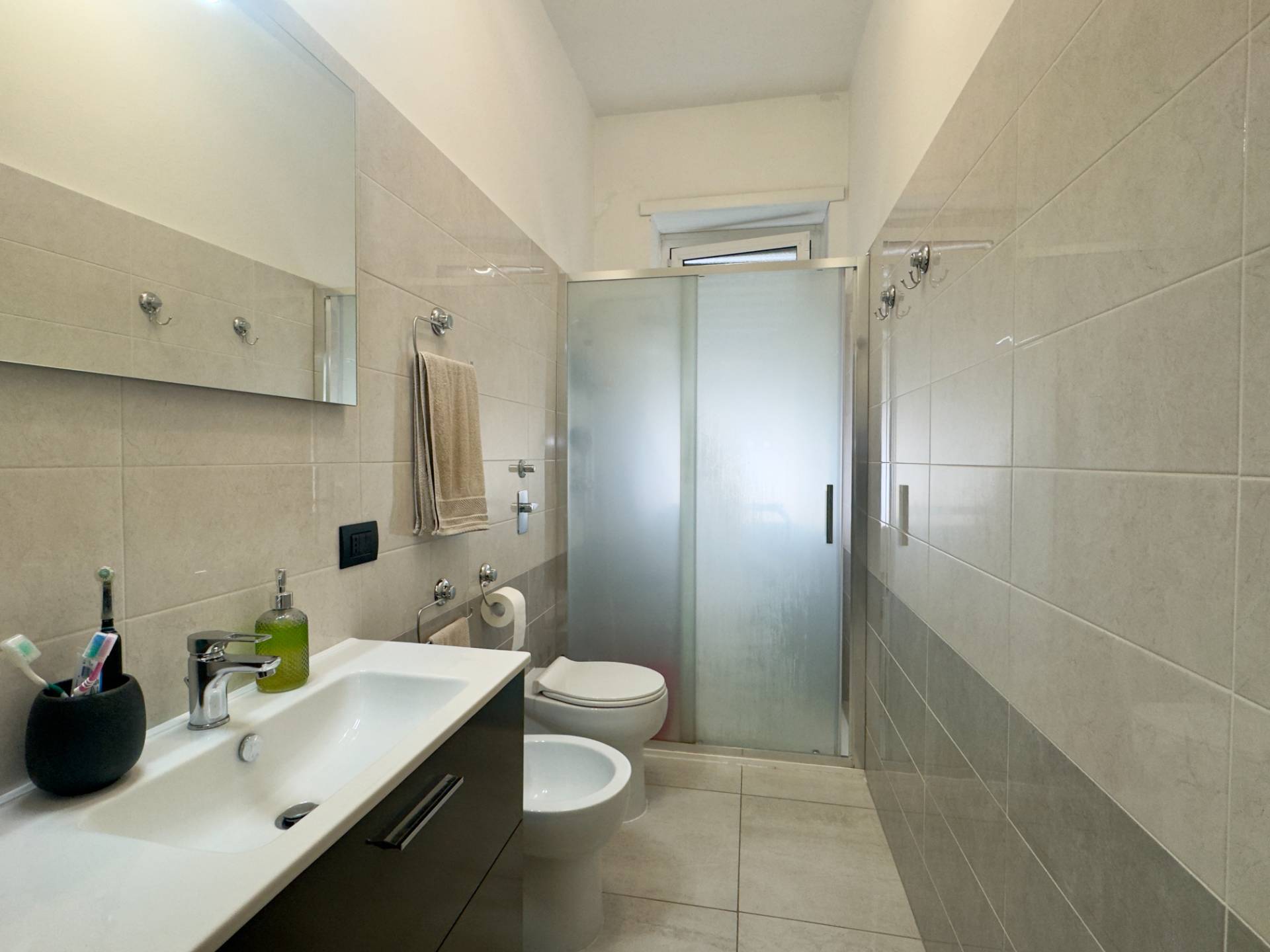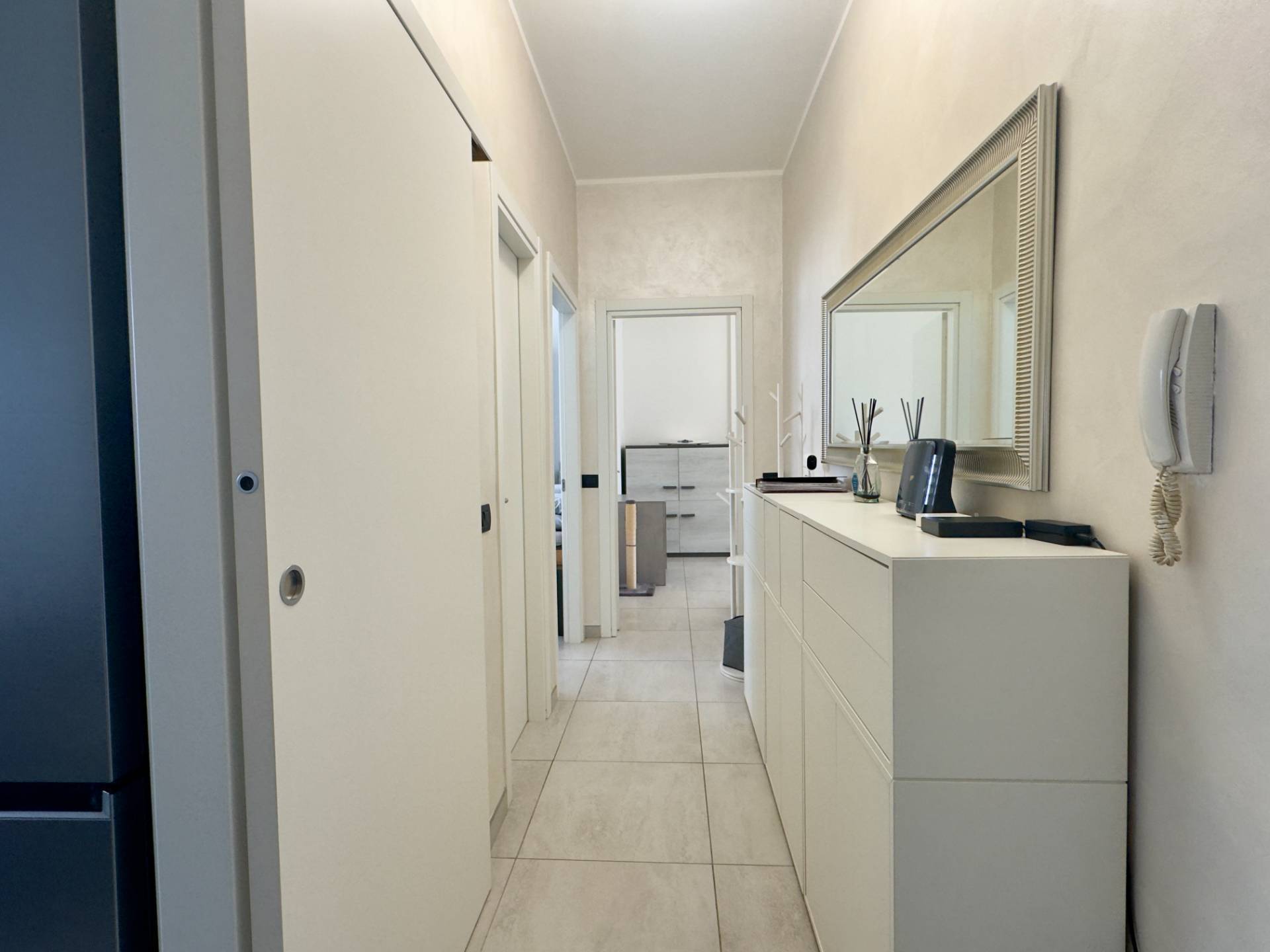L'immobile si presenta in ottime condizioni interne grazie alla recente ritrutturazione totale, la pavimentazione è in gres porcellanato, gli infissi sono in alluminio con doppio vetro che assicurano un buon isolamento acustico e termico. L'appartamento è inoltre dotato di aria condizionata nella zona giorno e nella camera da letto, mentre il riscaldamento è centralizzato con elementi radianti a pavimento. La presenza delle porte scorrevoli interne consente una gestione intelligente degli spazi.