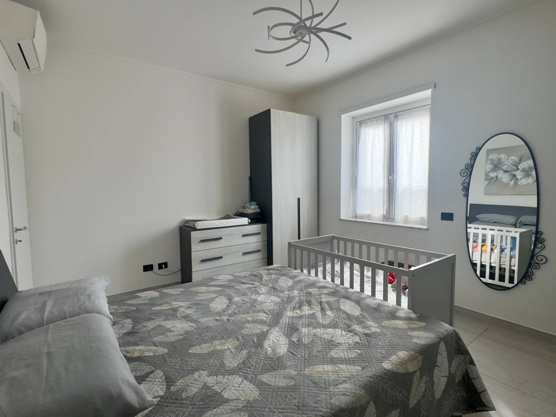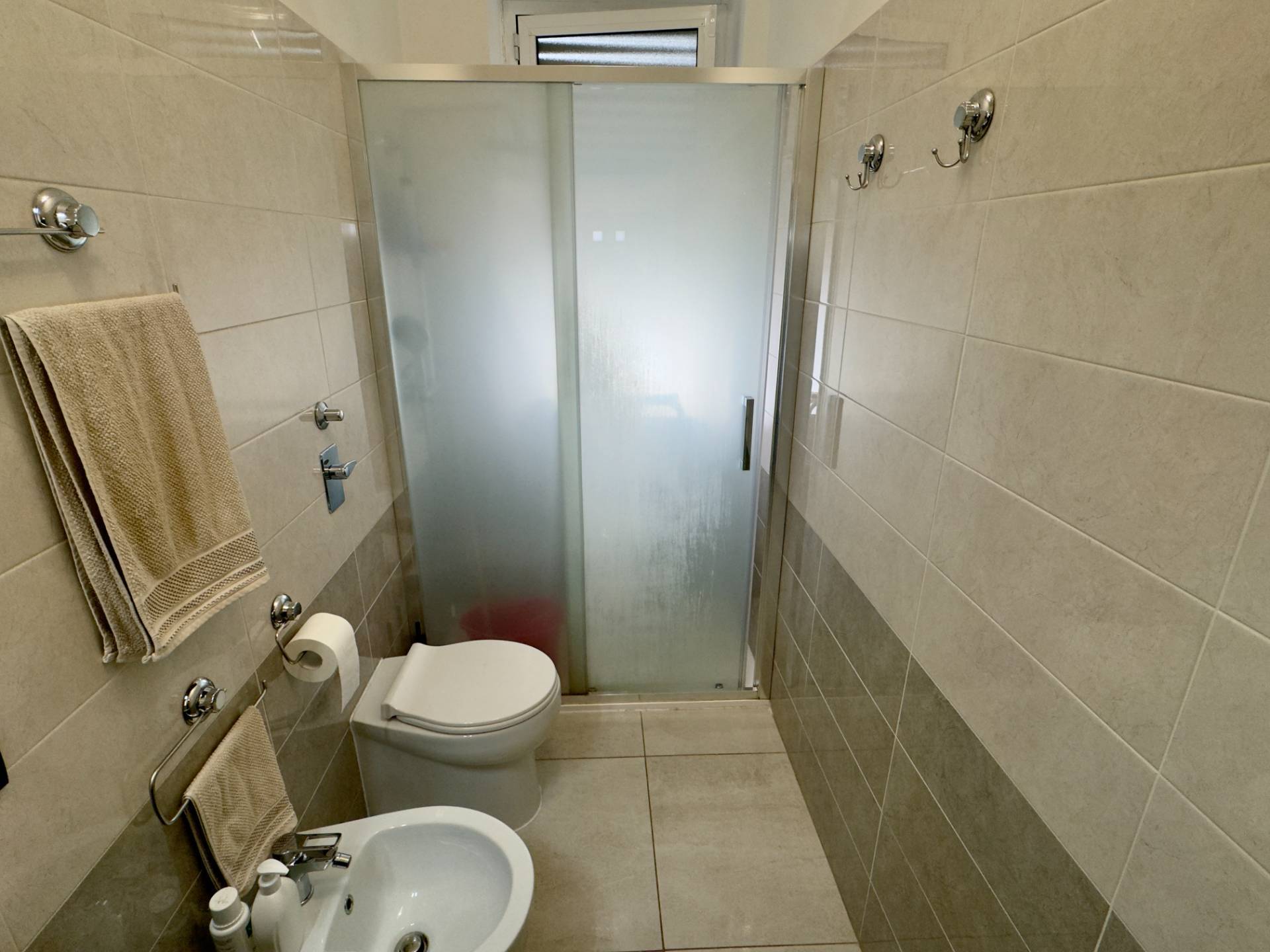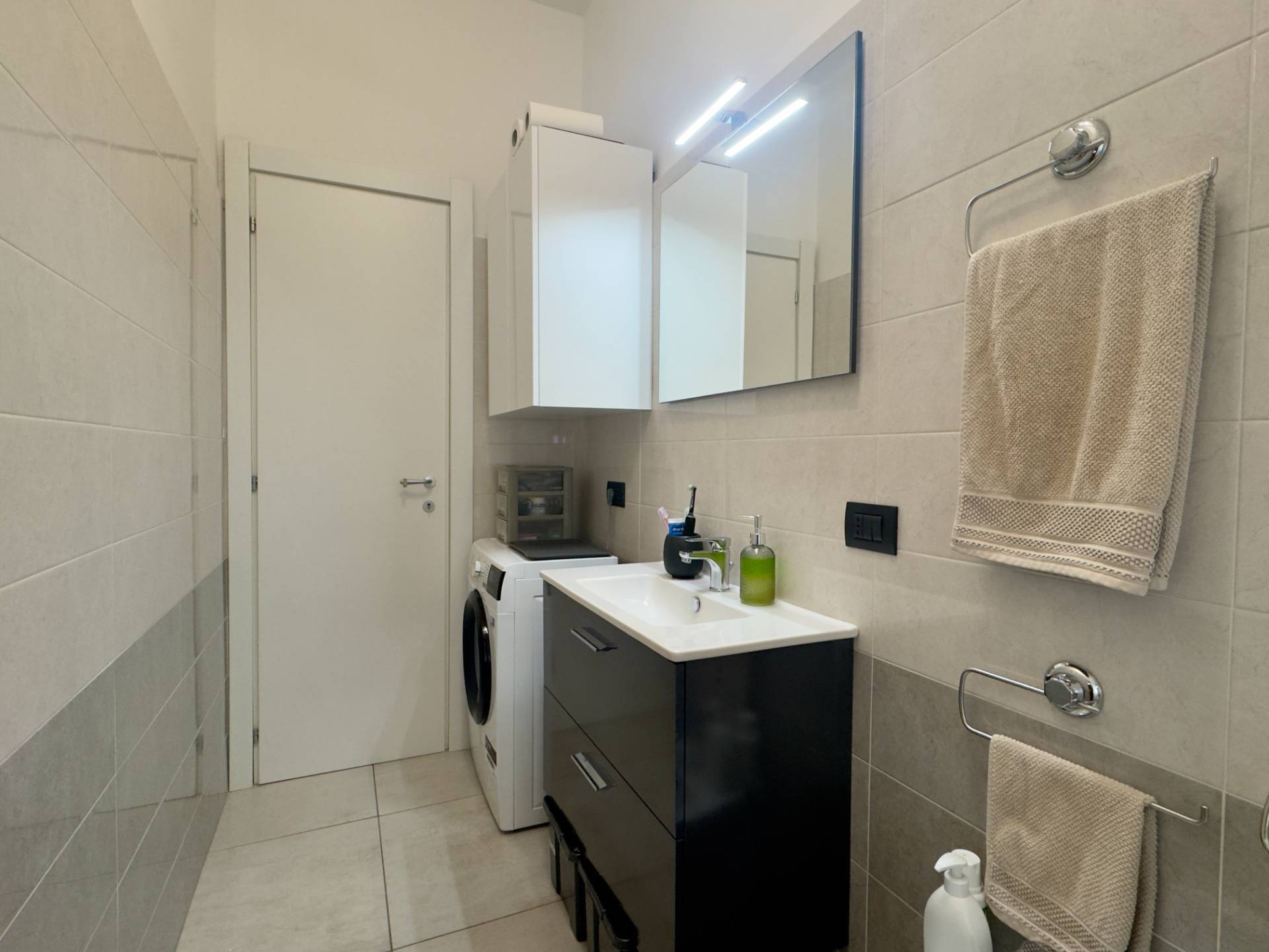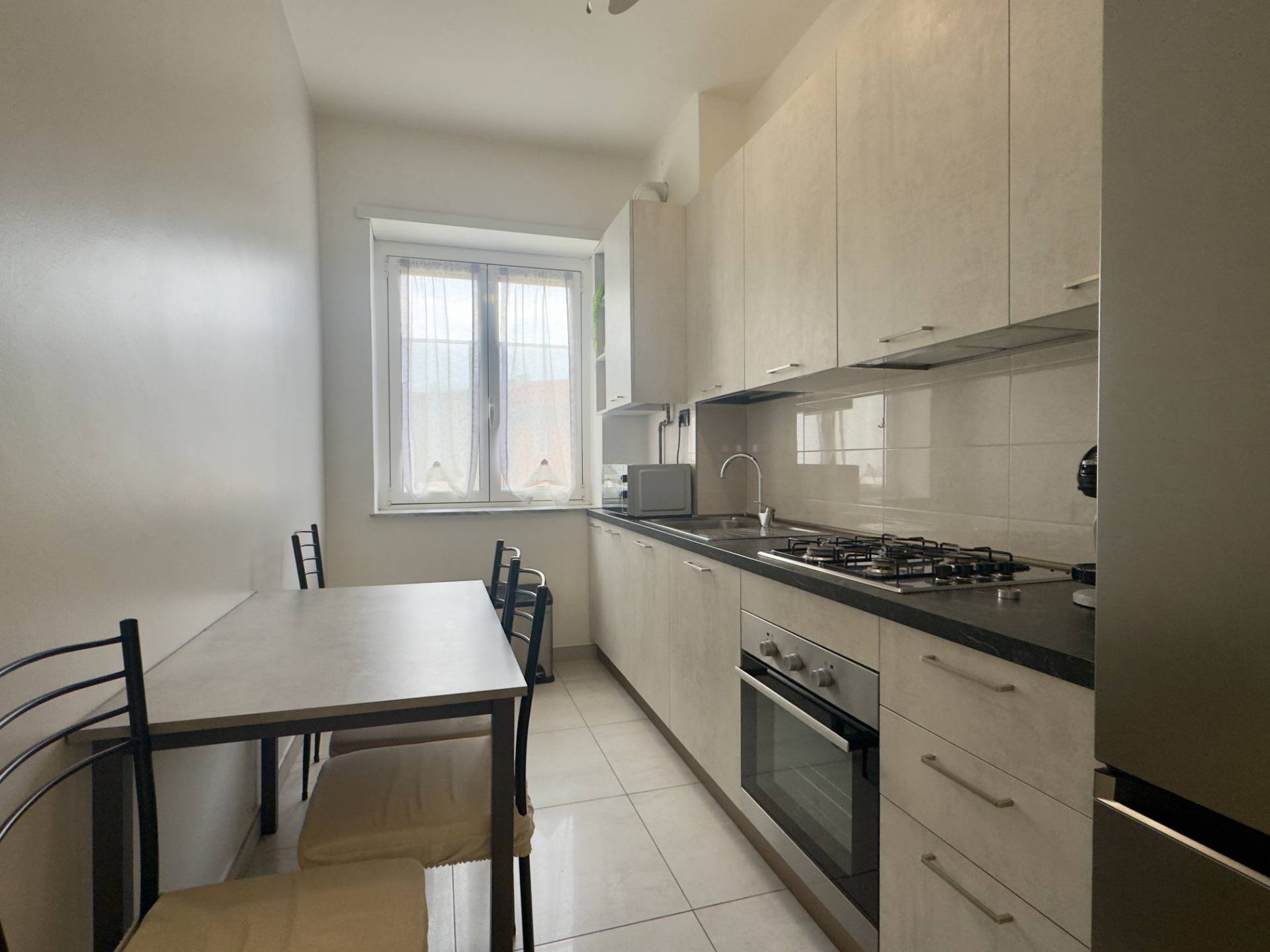L'immobile si presenta in ottime condizioni interne grazie alla recente ritrutturazione totale, la pavimentazione è in gres porcellanato, gli infissi sono in alluminio con doppio vetro che assicurano un buon isolamento acustico e termico. L'appartamento è inoltre dotato di aria condizionata nella zona giorno e nella camera da letto, mentre il riscaldamento è centralizzato con elementi radianti a pavimento. La presenza delle porte scorrevoli interne consente una gestione intelligente degli spazi.