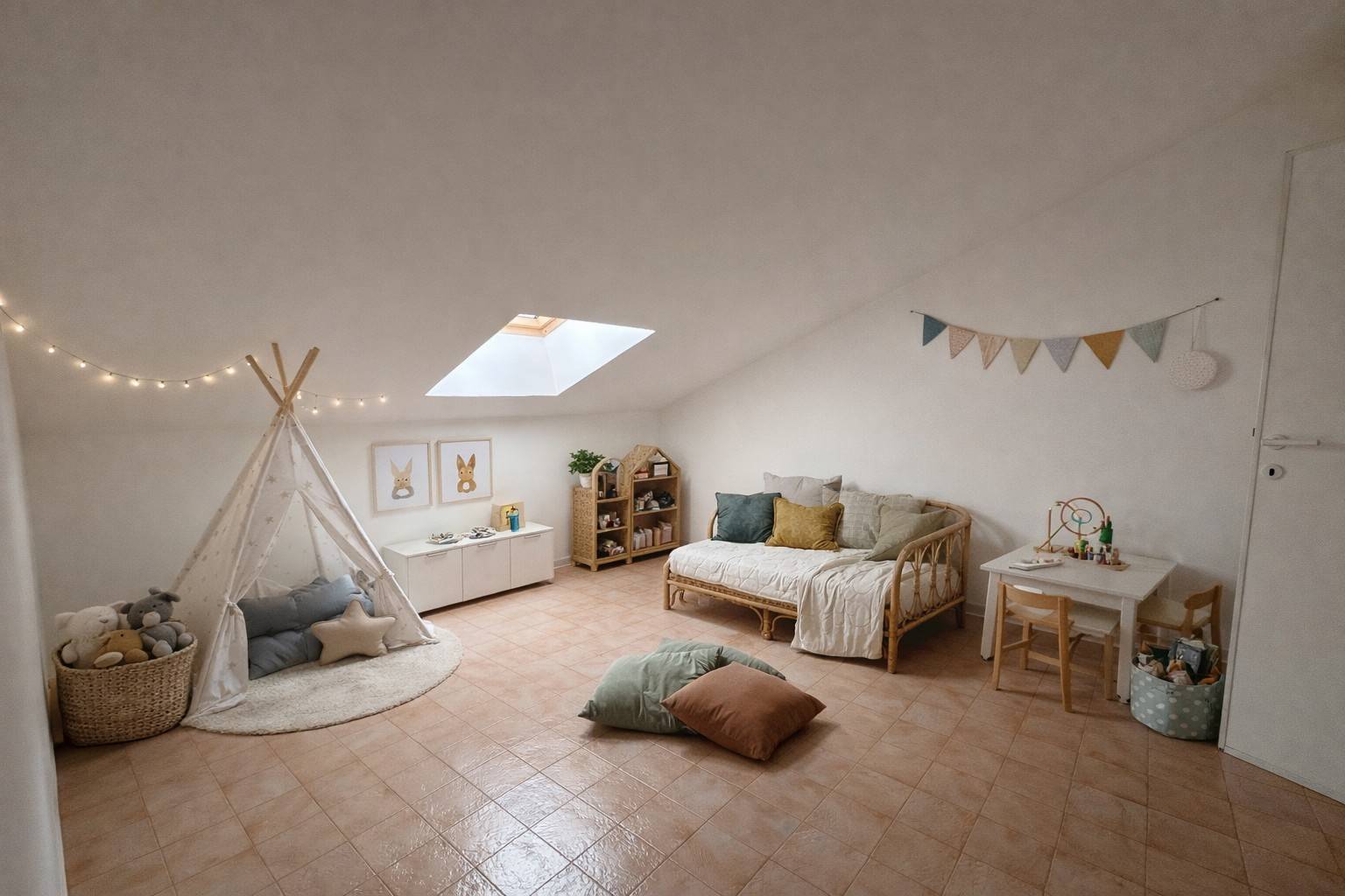 Salendo al secondo piano troviamo un attico con zona soggiorno, cucina, due camere e bagno: uno spazio indipendente che apre a diverse possibilità.