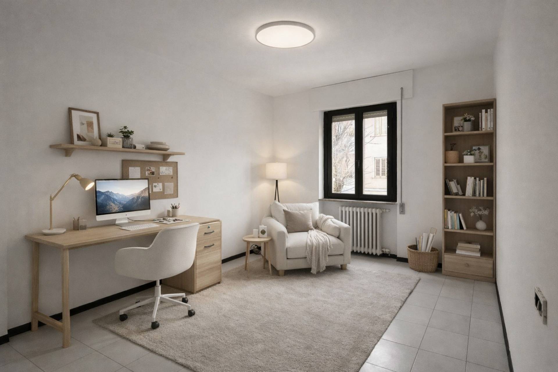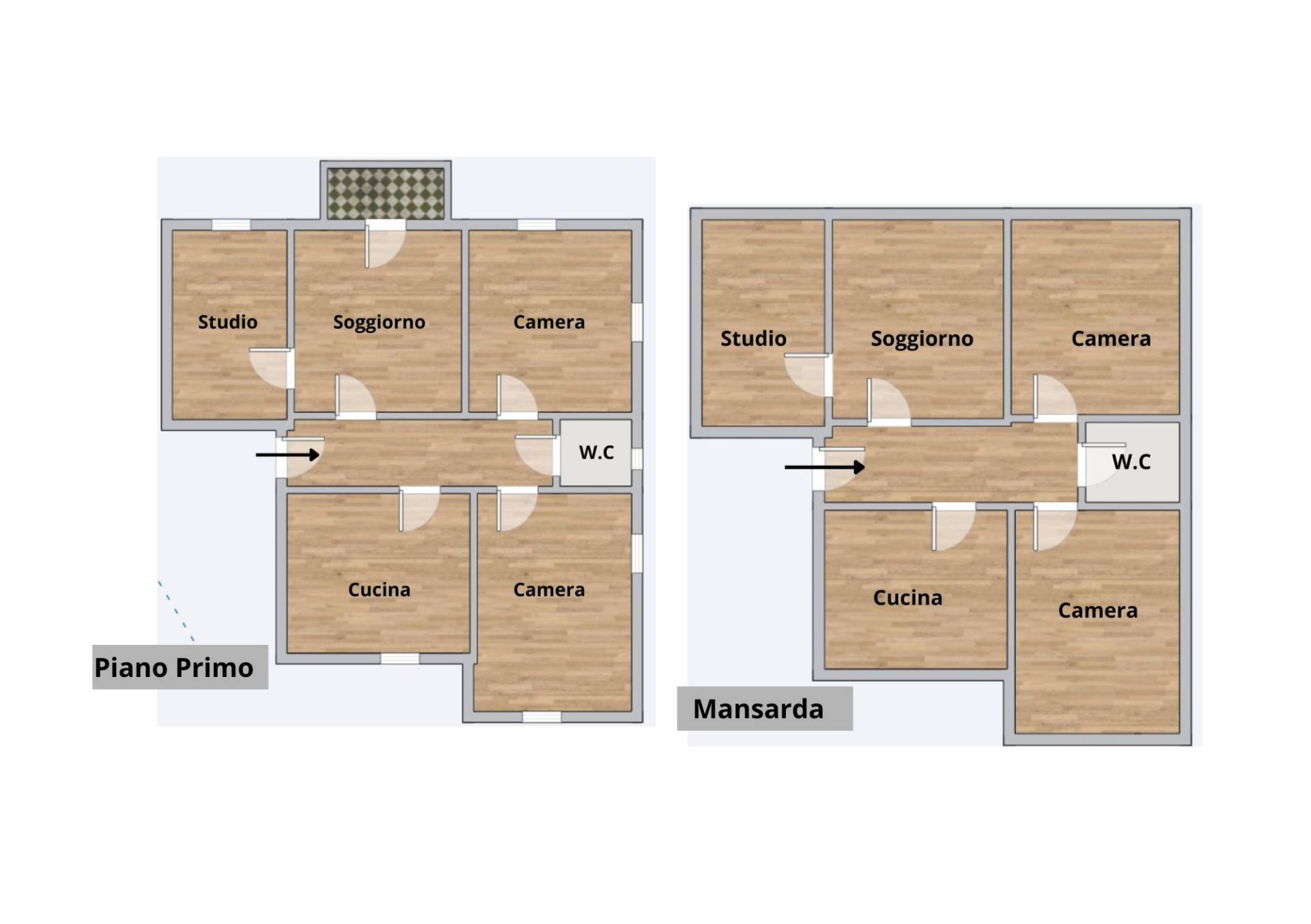 Al primo piano veniamo accolti da un ingresso che conduce ad un soggiorno luminoso e ben proporzionato, uno studio ideale per chi lavora da casa, una cucina abitabile separata, due camere da letto e un bagno. Gli ambienti sono ben distribuiti, ariosi e funzionali, perfetti per una famiglia o per chi desidera spazi comodi e ben organizzati.