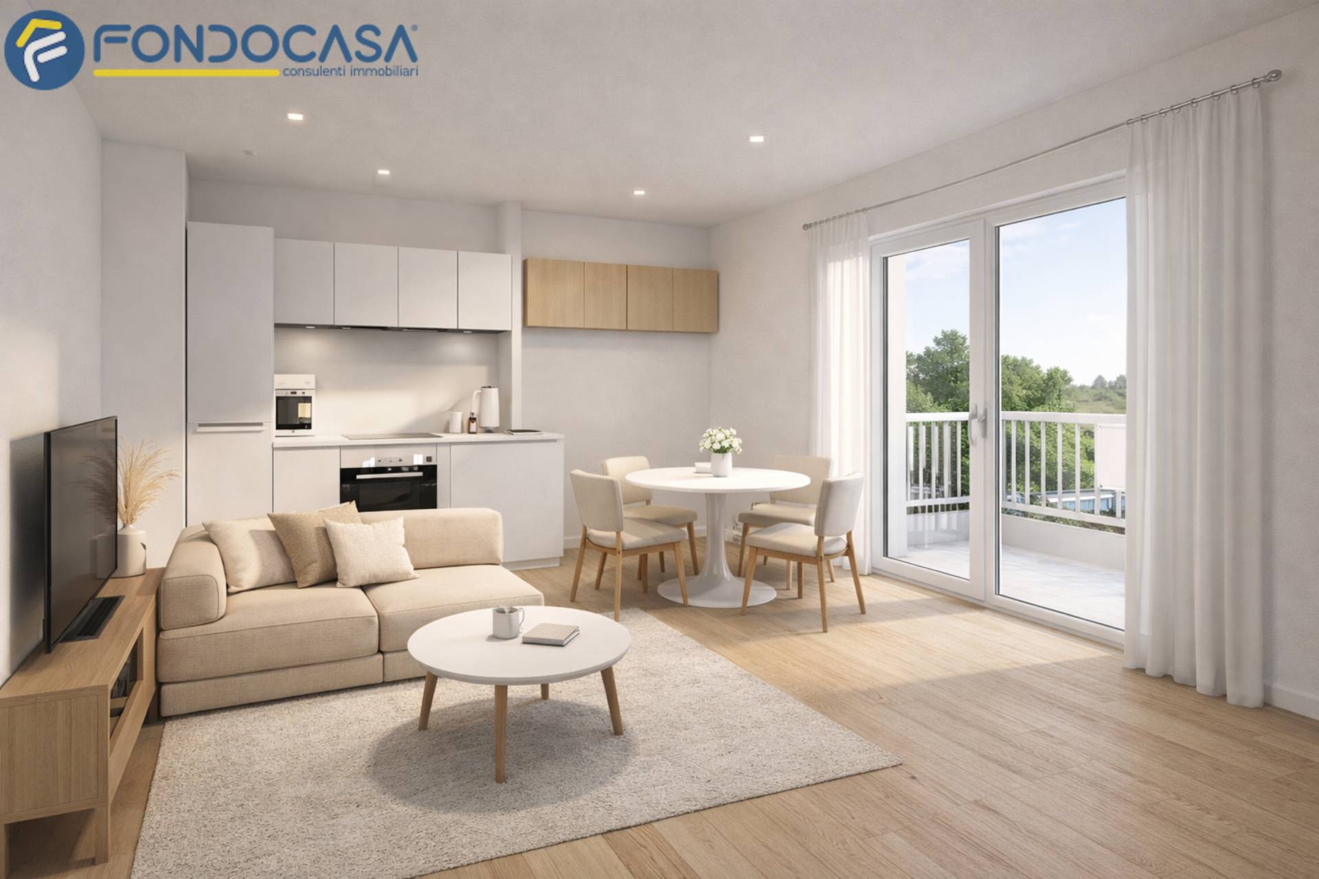 - ingresso su soggiorno con angolo cottura, luminoso con affaccio sul balcone panoramico;