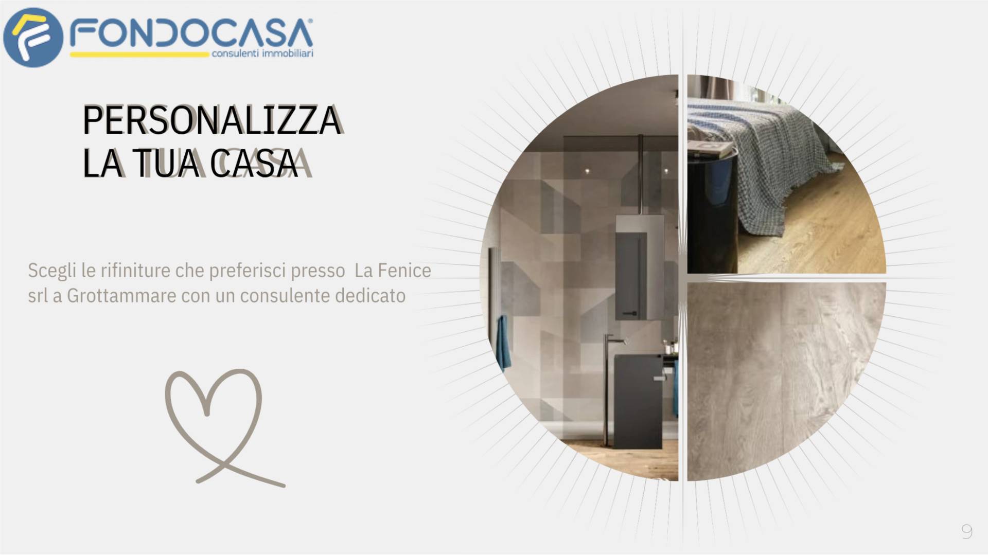 Il futuro acquirente potrà inoltre scegliere le finiture (pavimenti, rivestimenti, ecc.) presso fornitore specializzato, personalizzando la casa secondo il proprio gusto.