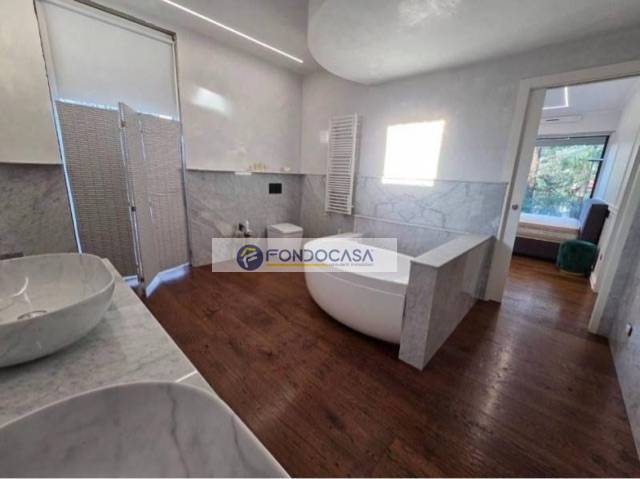 Suite padronale: un vero e proprio santuario privato con cabina armadio, bagno privato con vasca idromassaggio, finiture in marmo e stucco veneziano, il tutto con vista sul verde lussureggiante.