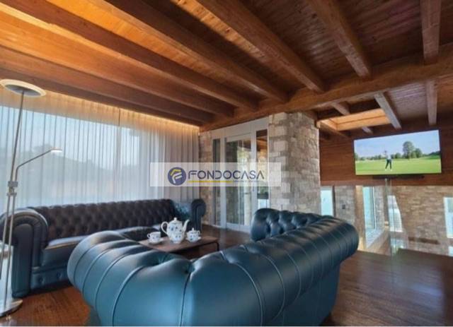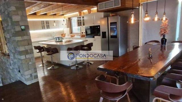 Soggiorno open space: un monumentale soggiorno a doppia altezza caratterizzato da volumi generosi, finiture di pregio, parquet in rovere antico e pietra naturale scolpita a mano.