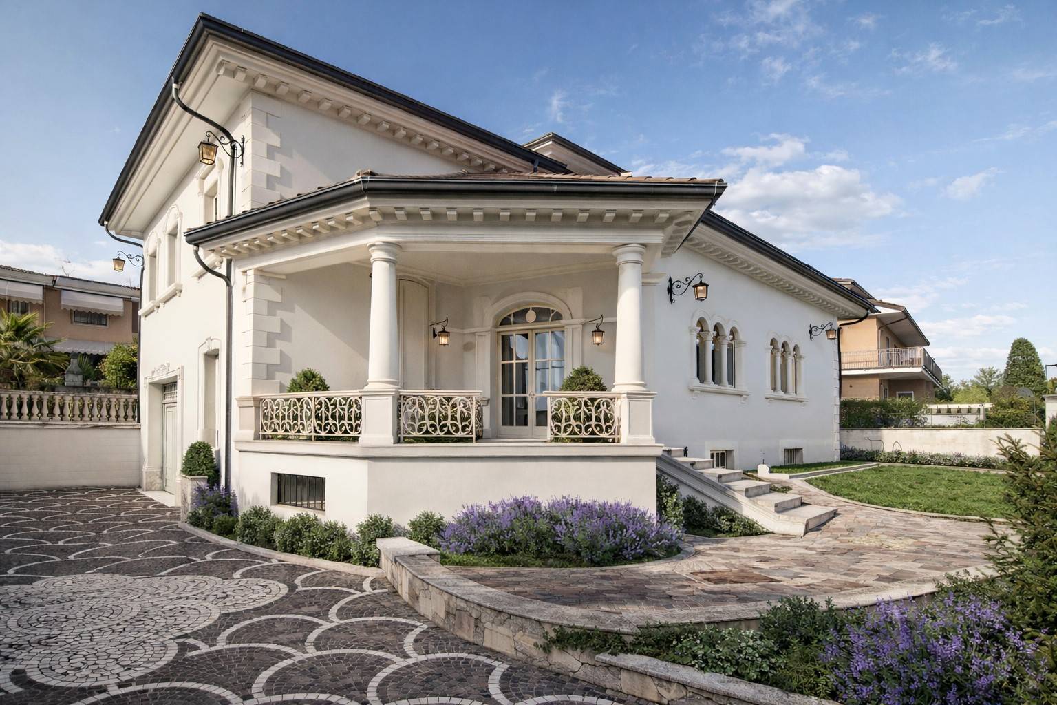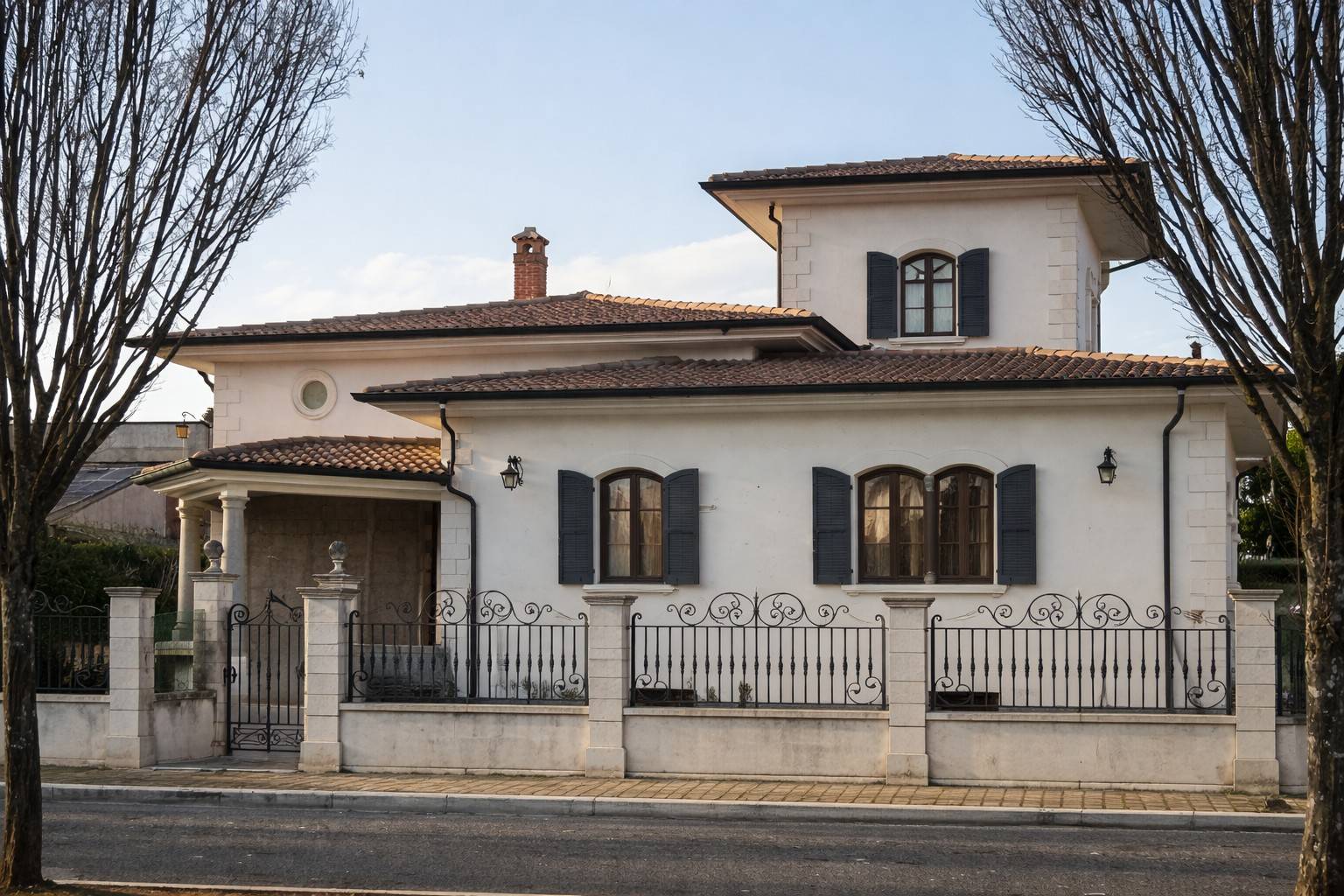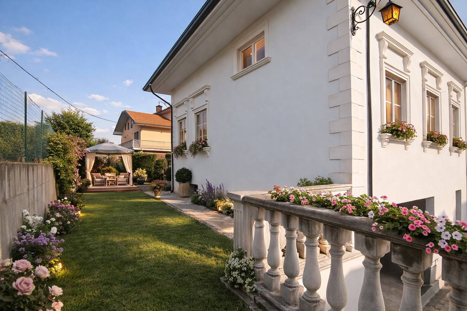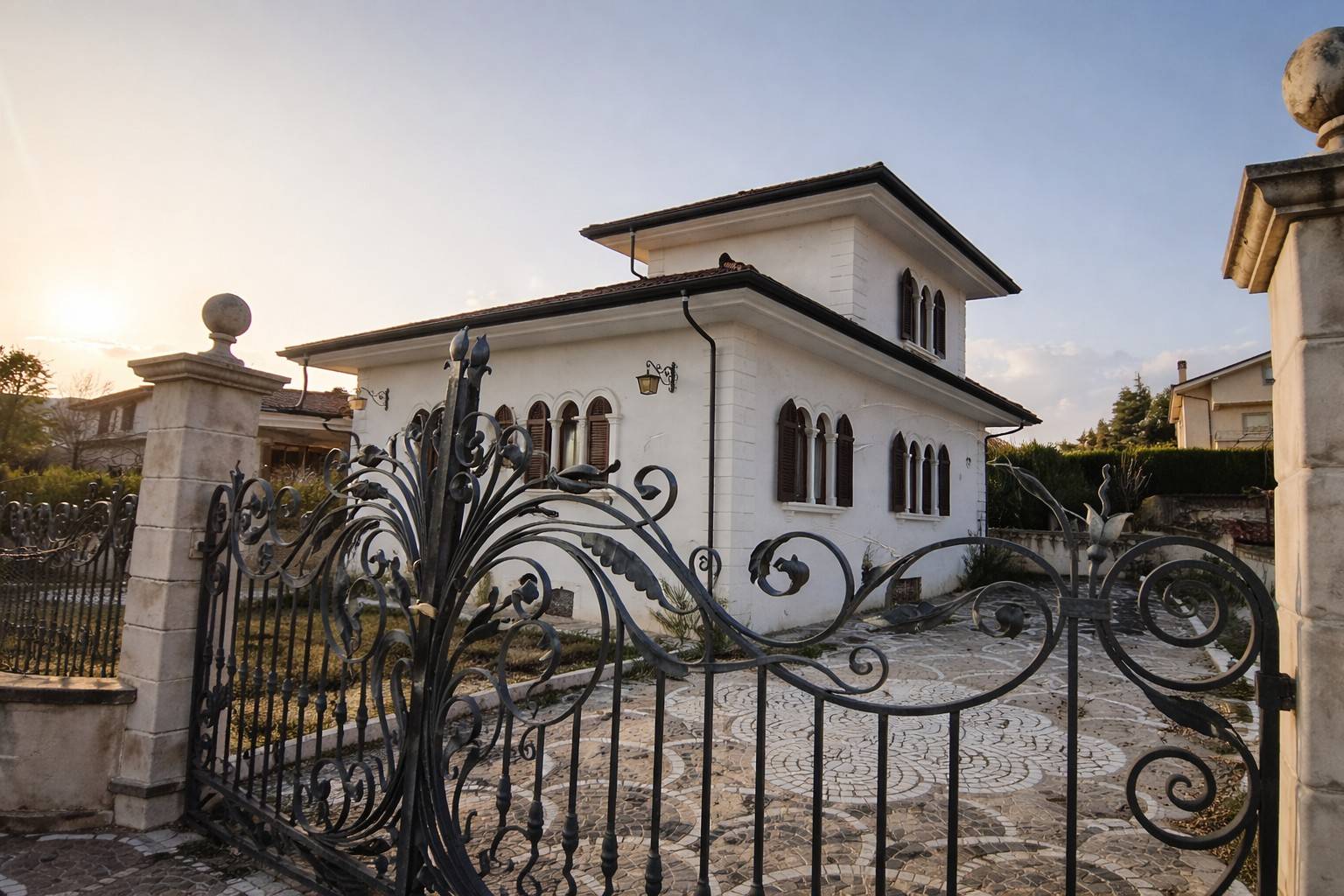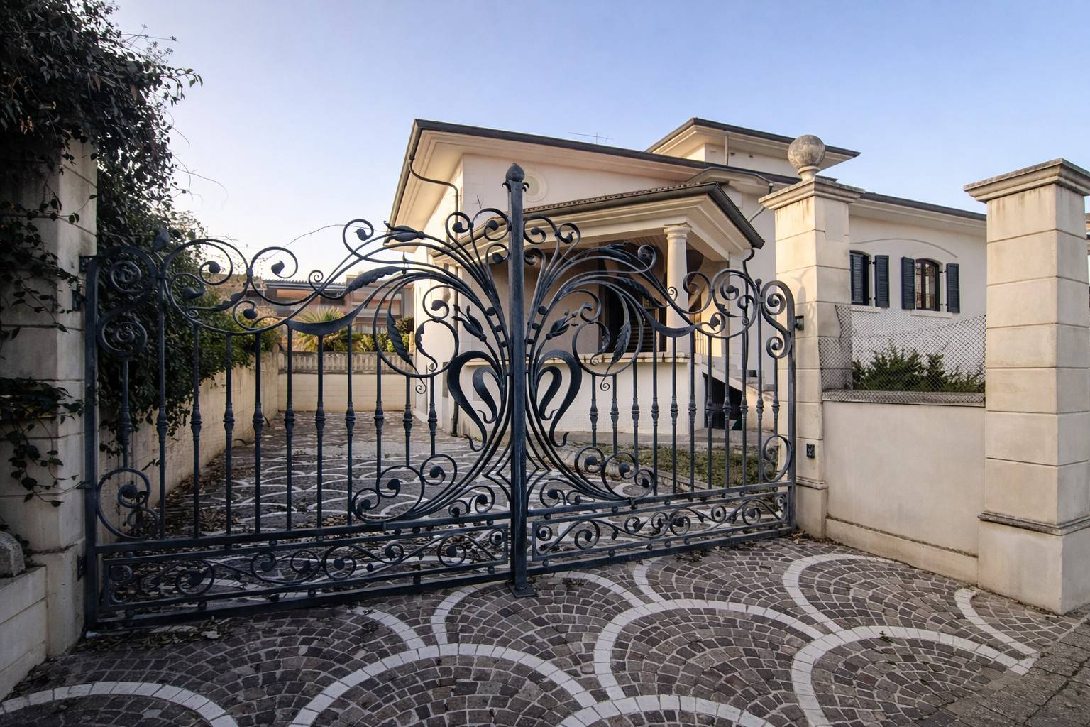 La proprietà è circondata da un curato giardino perimetrale che garantisce privacy e valorizza l´estetica dell´abitazione. L´ingresso è impreziosito da un raffinato cancello in ferro pieno lavorato artigianalmente, dotato di due accessi carrabili e uno pedonale, coordinato con una ringhiera realizzata con ferro puro di pregio, arricchita da eleganti lavorazioni decorative.