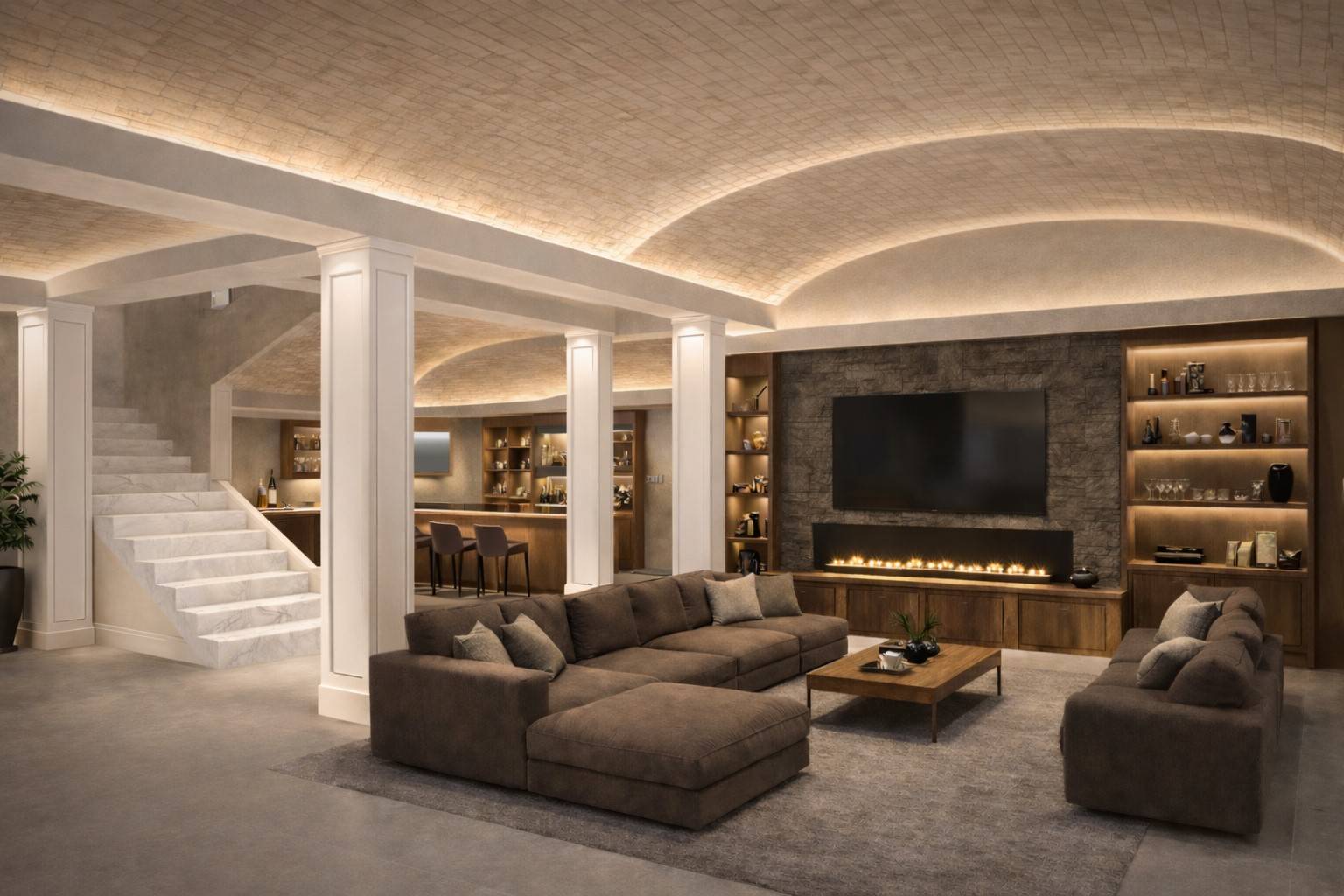 Il piano terra accoglie un ampio garage doppio e una suggestiva taverna in stile grottino, un ambiente dal grande potenziale progettuale, completamente personalizzabile nella distribuzione degli spazi. L´area è stata concepita per ospitare una cucina a vista, una spaziosa zona living con camino, oltre a bagno e cantina, creando un ambiente ideale per momenti conviviali, cene con amici o spazi dedicati al relax.