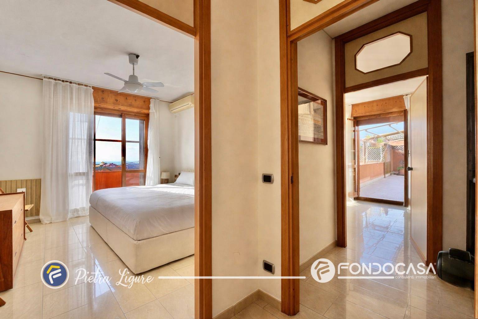 Grazie al disimpegno si accede alla camera matrimoniale, anch'essa con sfogo sulla balconata, ed al bagno finestrato con vasca.