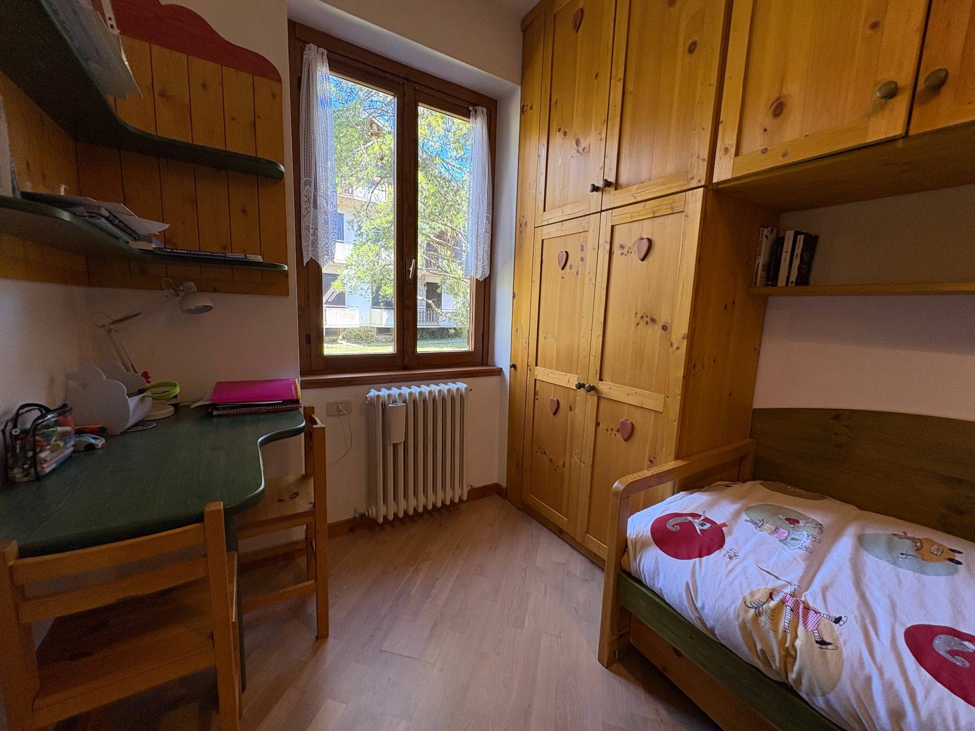 La zona notte, ben distribuita, comprende una camera matrimoniale comunicante con il terrazzo, una seconda camera con vista panoramica sulla montagna e un bagno finestrato.