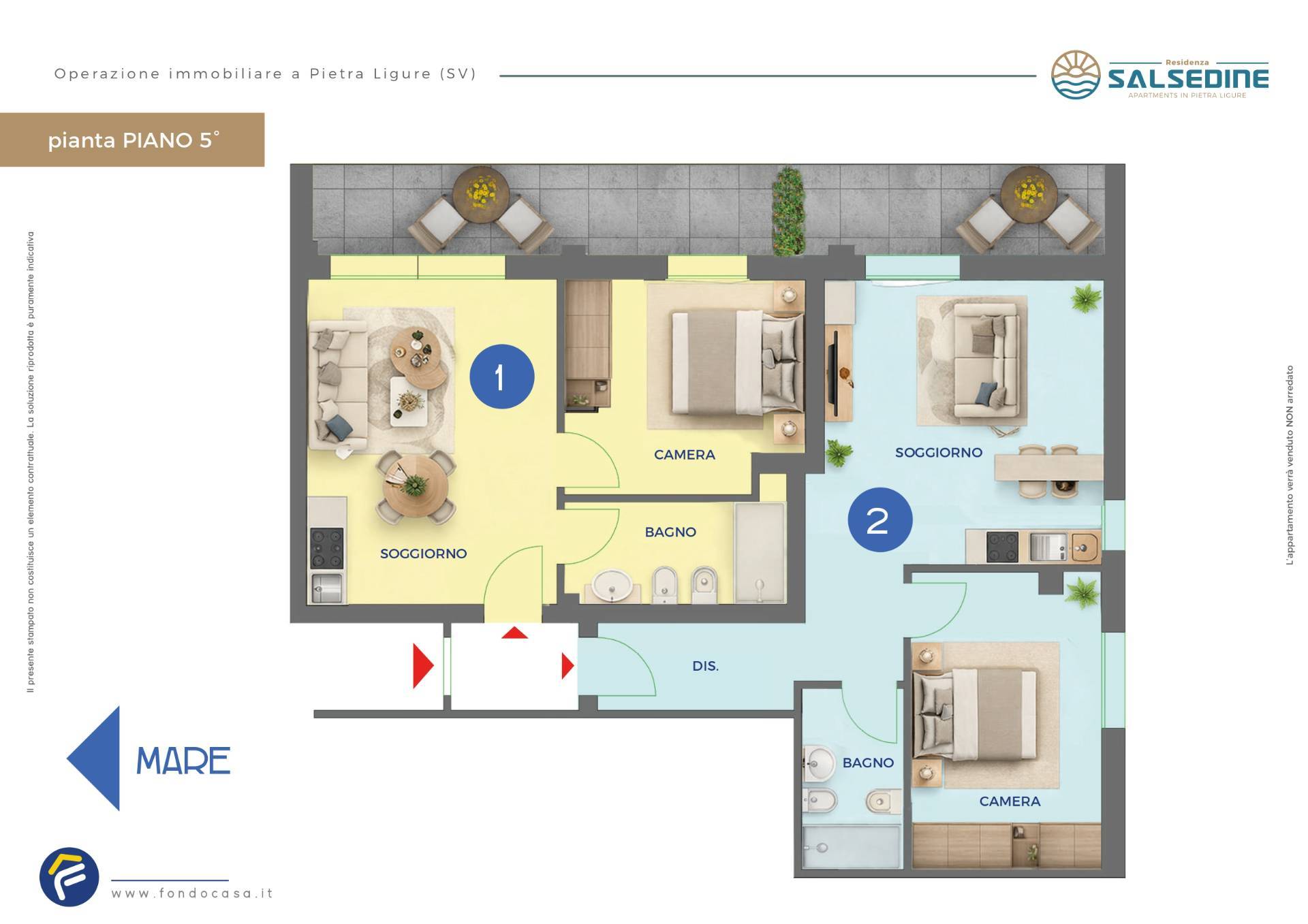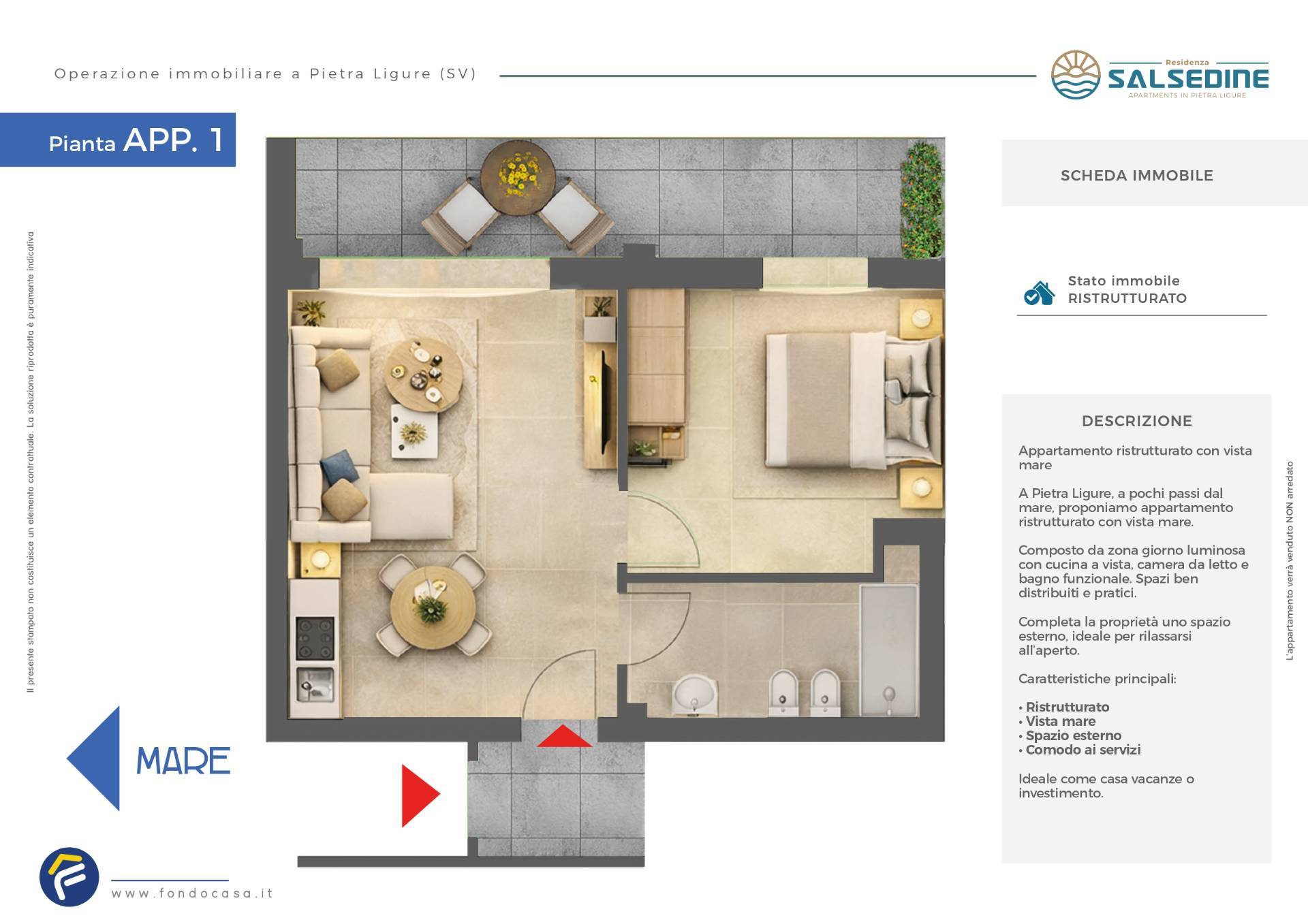 Fondocasa è lieta di presentare un' operazione immobiliare a Pietra Ligure: la ristrutturazione di due appartamenti bilocali situati a soli 50 metri dalle splendide spiagge locali e dal centro storico di Pietra Ligure.
