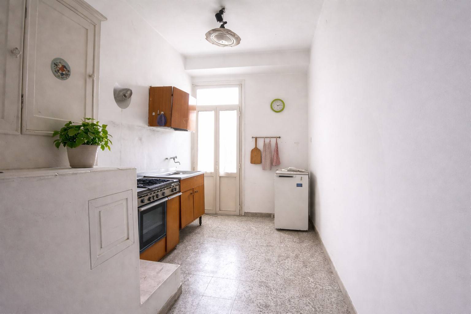 Piano primo: una luminosa cucina con accesso al balcone, un bagno e una comoda zona giorno composta da sala/soggiorno.