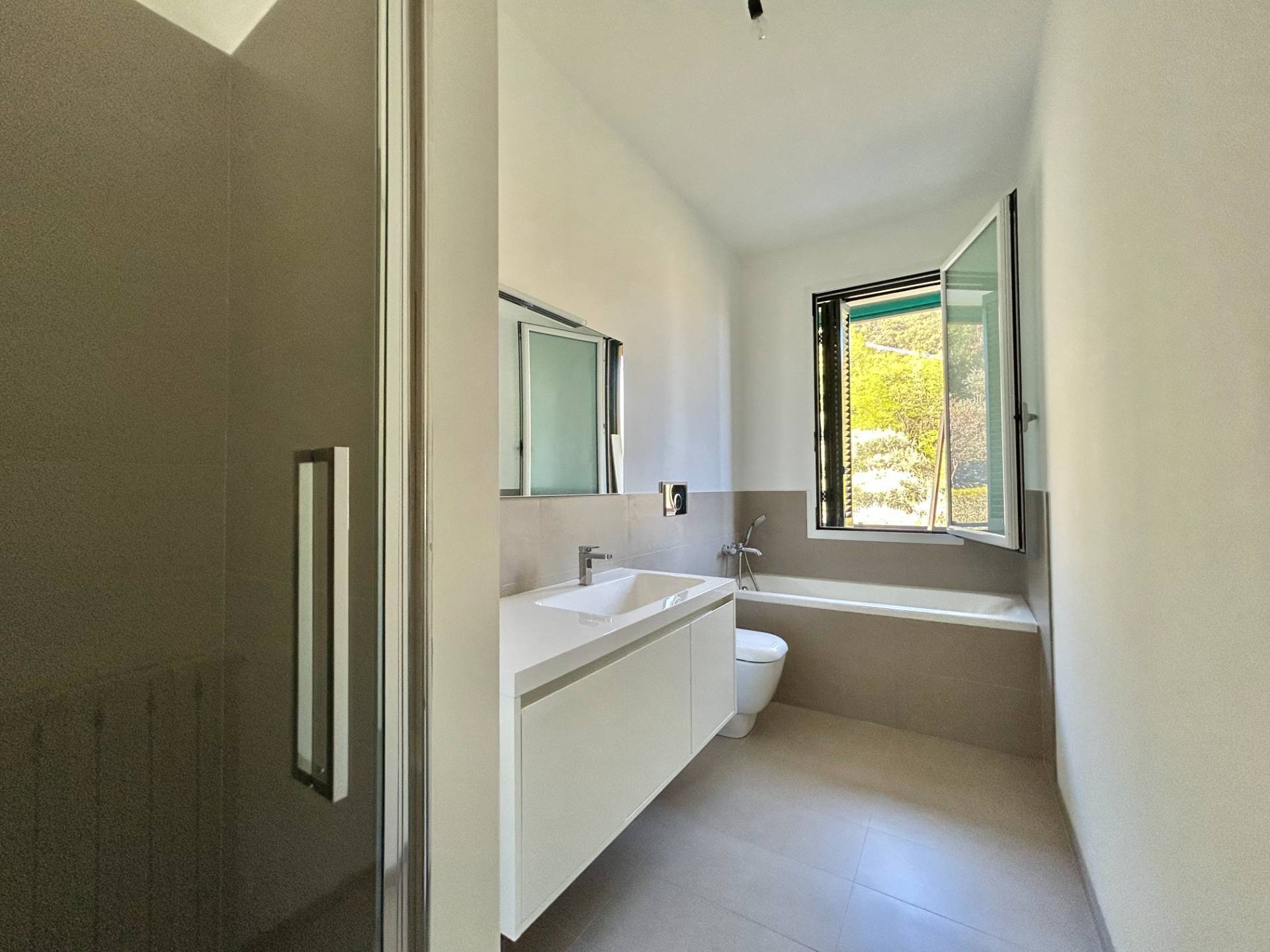 L´appartamento è composto da un grande doppio soggiorno con accesso diretto a una spaziosa terrazza con vista mare, cucina abitabile, due camere da letto e due bagni.