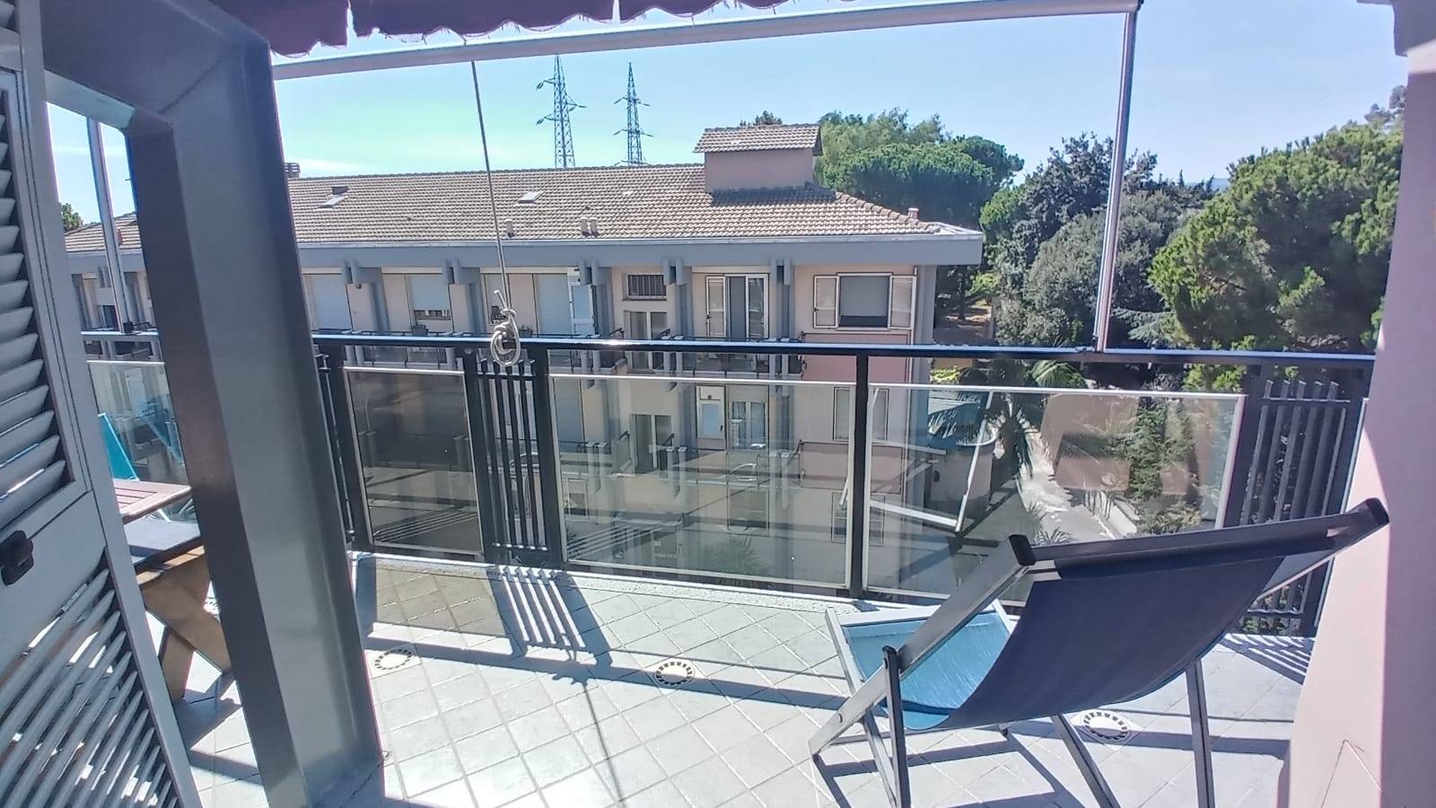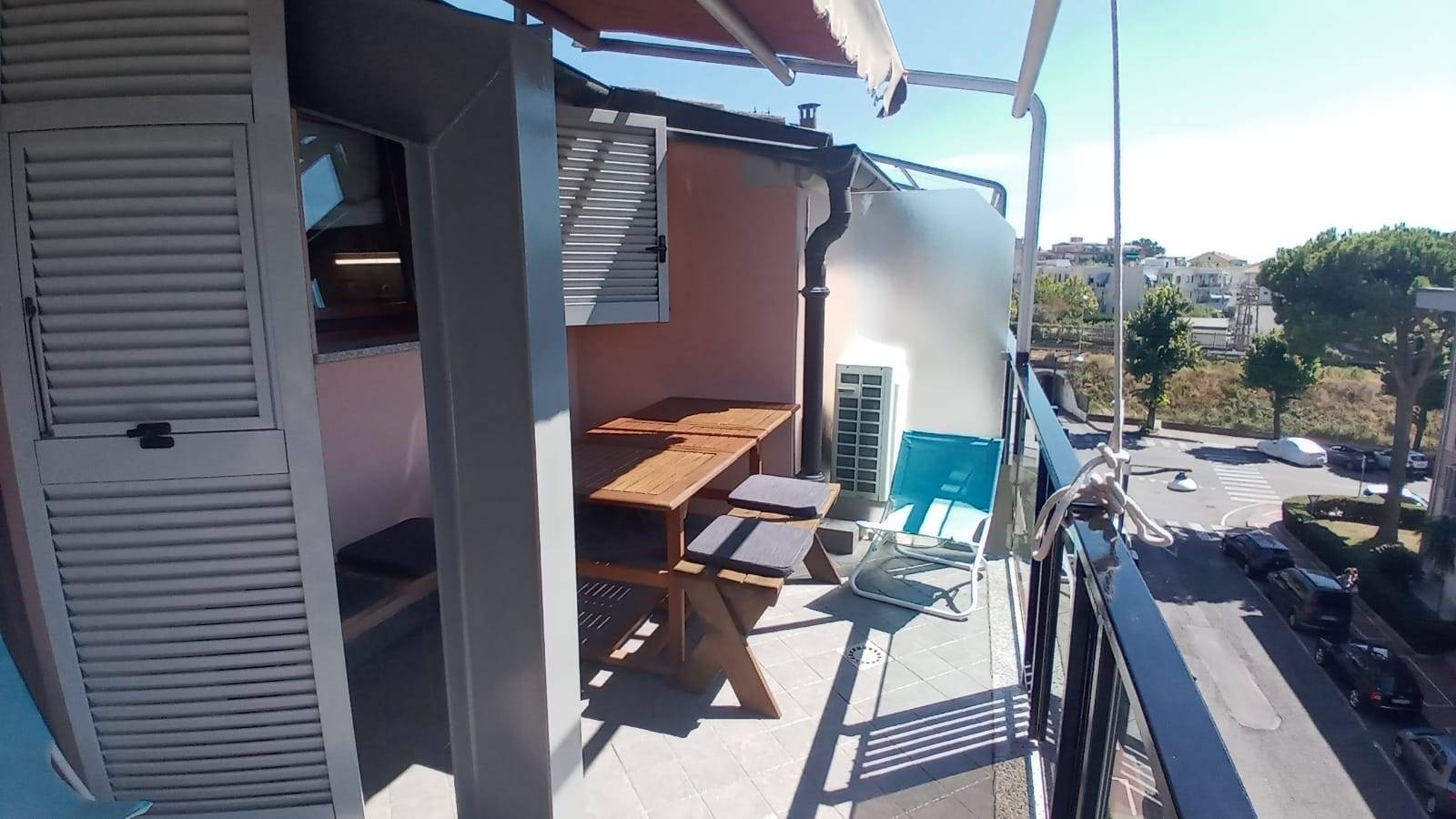 Vista aperta e molto ben esposto con un balcone che corre lungo tutto il perimetro dell'alloggio e si allarga in un terrazzino attrezzato di tavolo, panche e tenda sole per godere delle giornate di sole autunnali e primaverili tipiche della nostra regione.