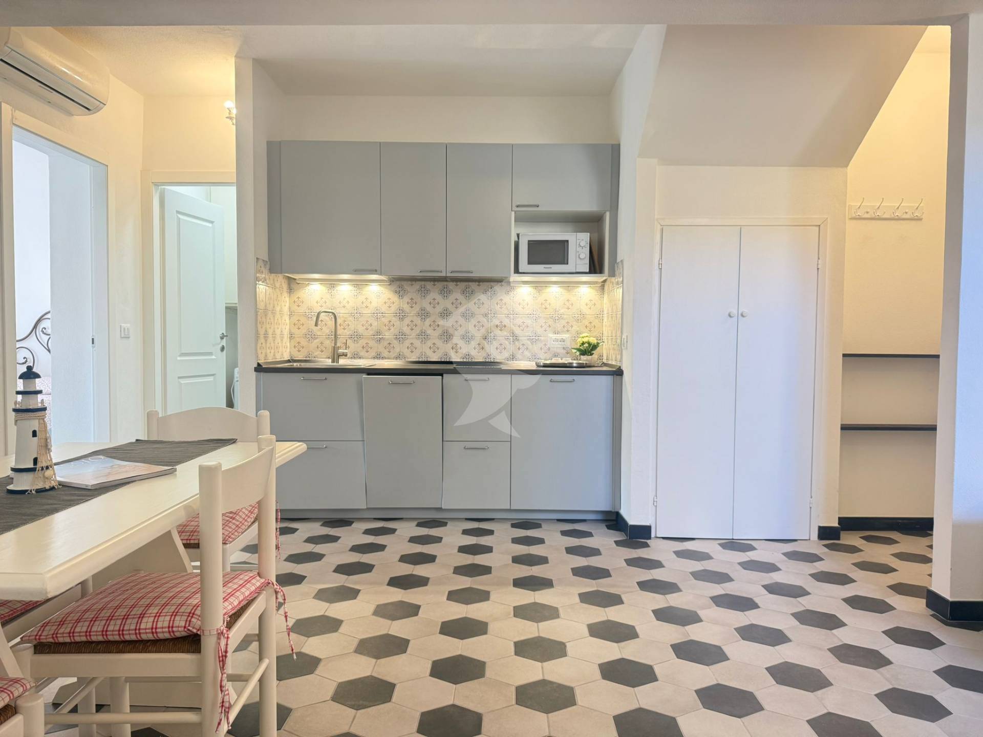 Composto da ingresso su ampio soggiorno con angolo cottura con piastra ad induzione, lavastoviglie, microonde, aria condizionata e divano letto, camera da letto spaziosa, studiata con estremo gusto e nei minimi dettagli, a completare bagno con doccia e lavatrice