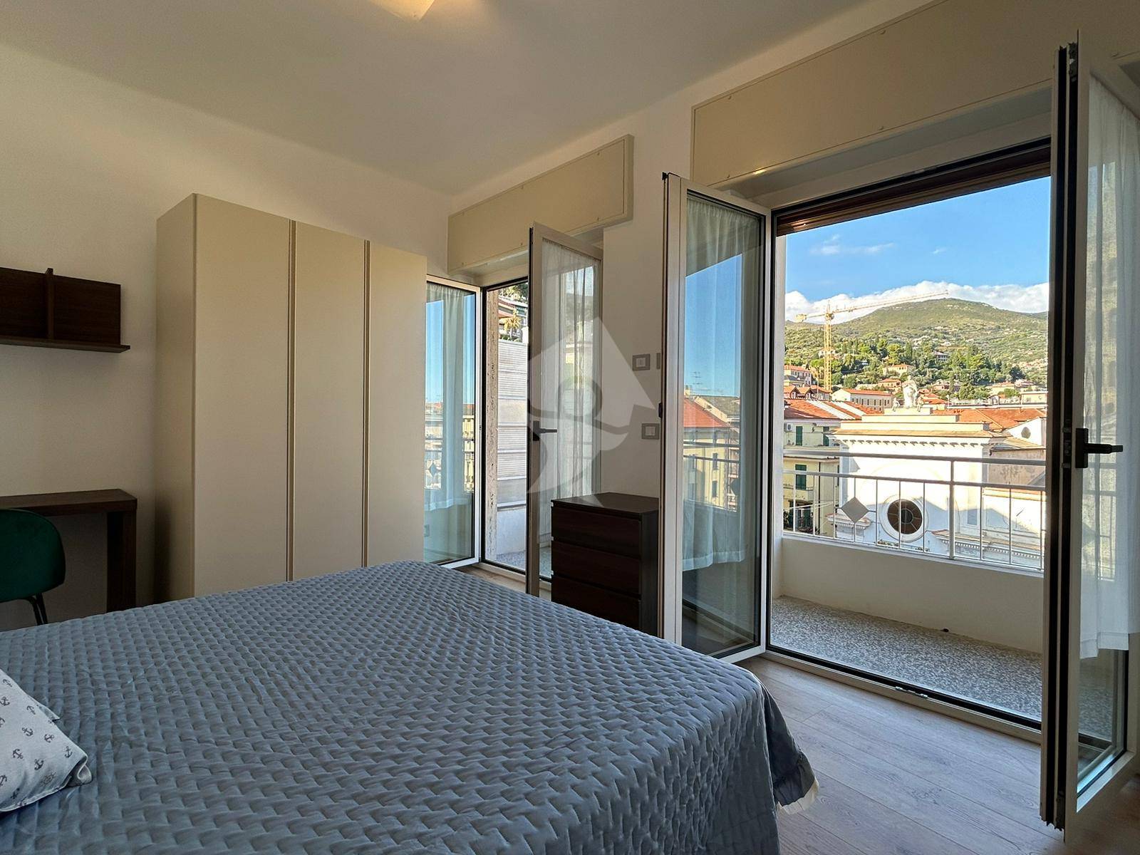 La camera matrimoniale, accogliente e ben proporzionata, è dotata di un balconcino privato, mentre la zona giorno, luminosa e ariosa, ospita un angolo cottura perfettamente integrato e si apre su un balcone semi-tondo, ideale per momenti di relax con vista.